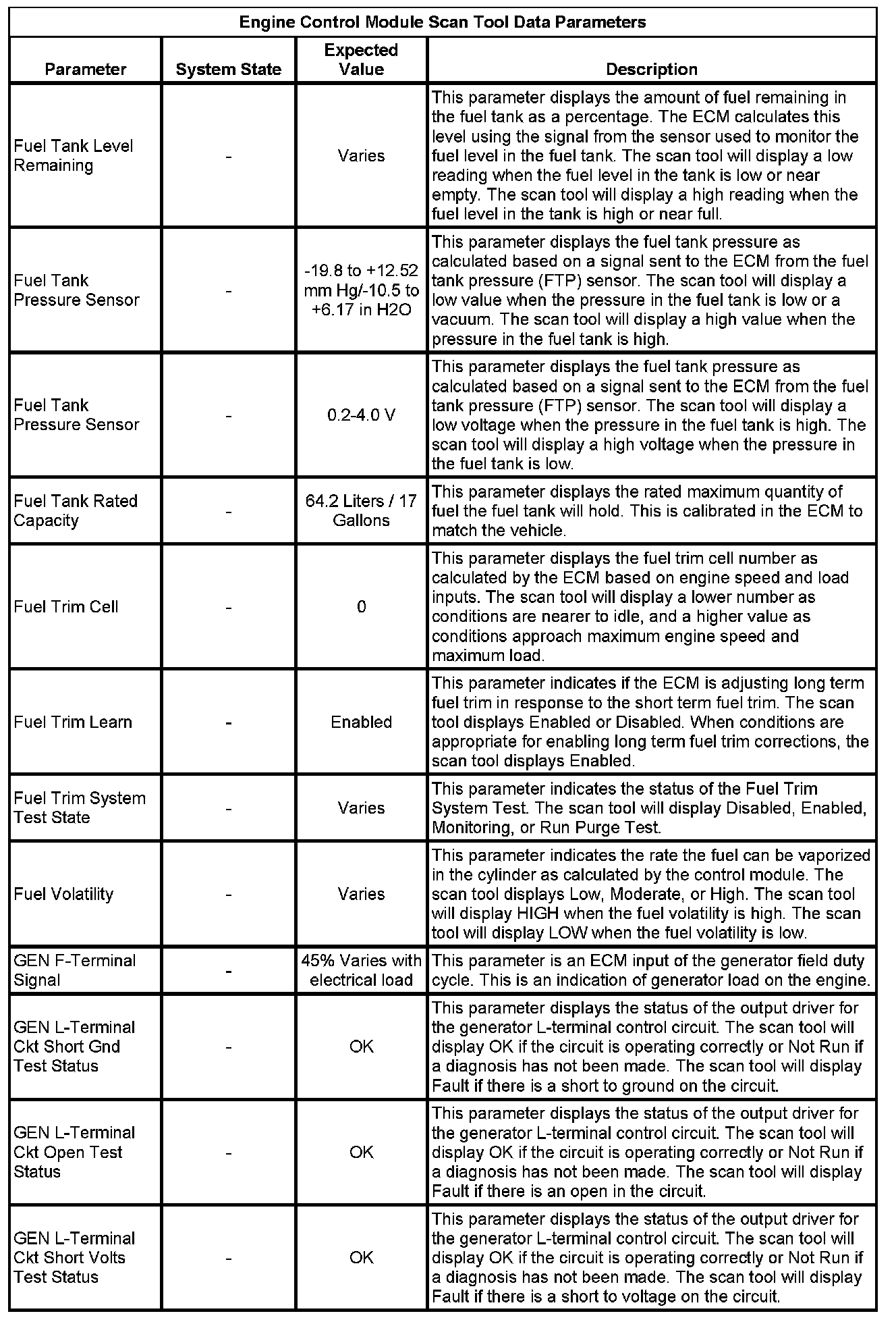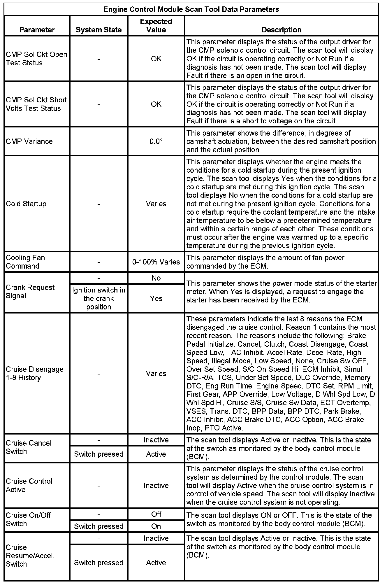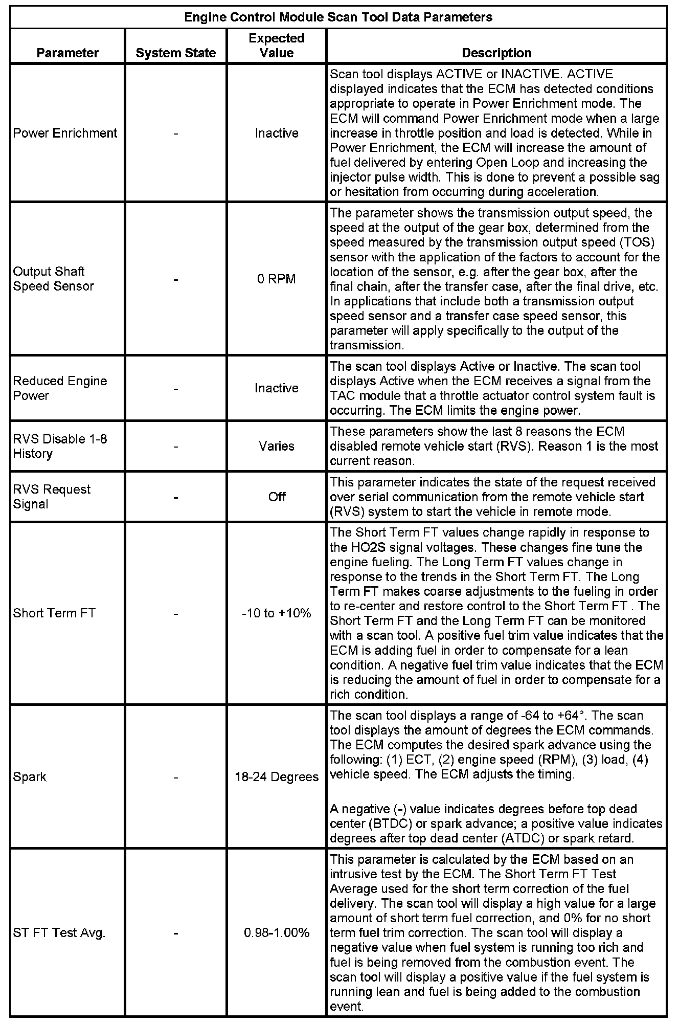 The Engine Control Module Scan Tool Data List contains all engine-related parameters that are available on the scan tool. The list is arranged in alphabetical order. A given parameter may appear in any one of the data lists, and in some cases may appear more than once, or in more than one data list in order to group certain related parameters together.
