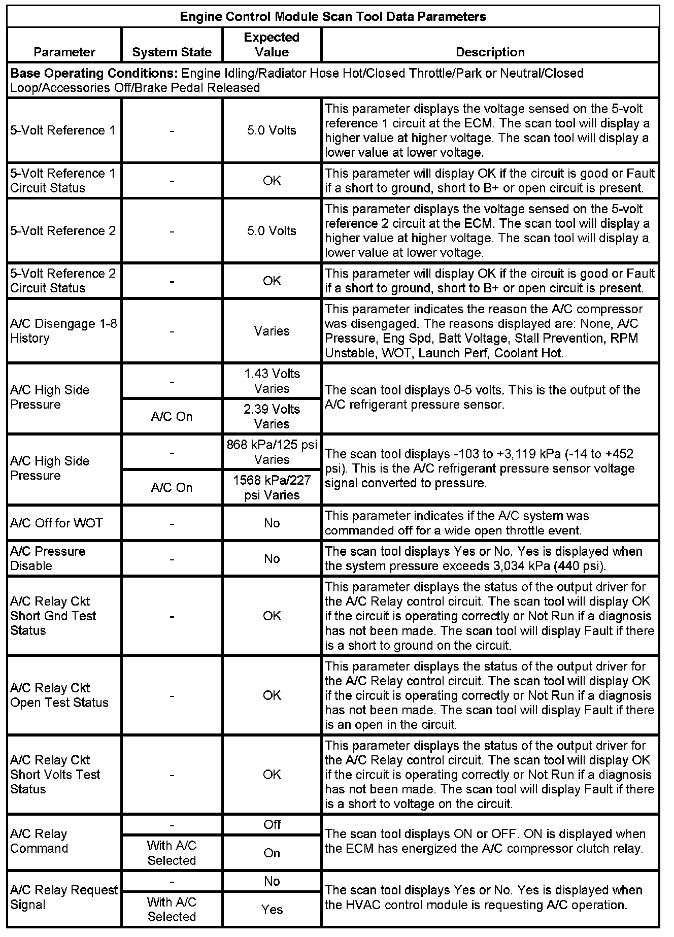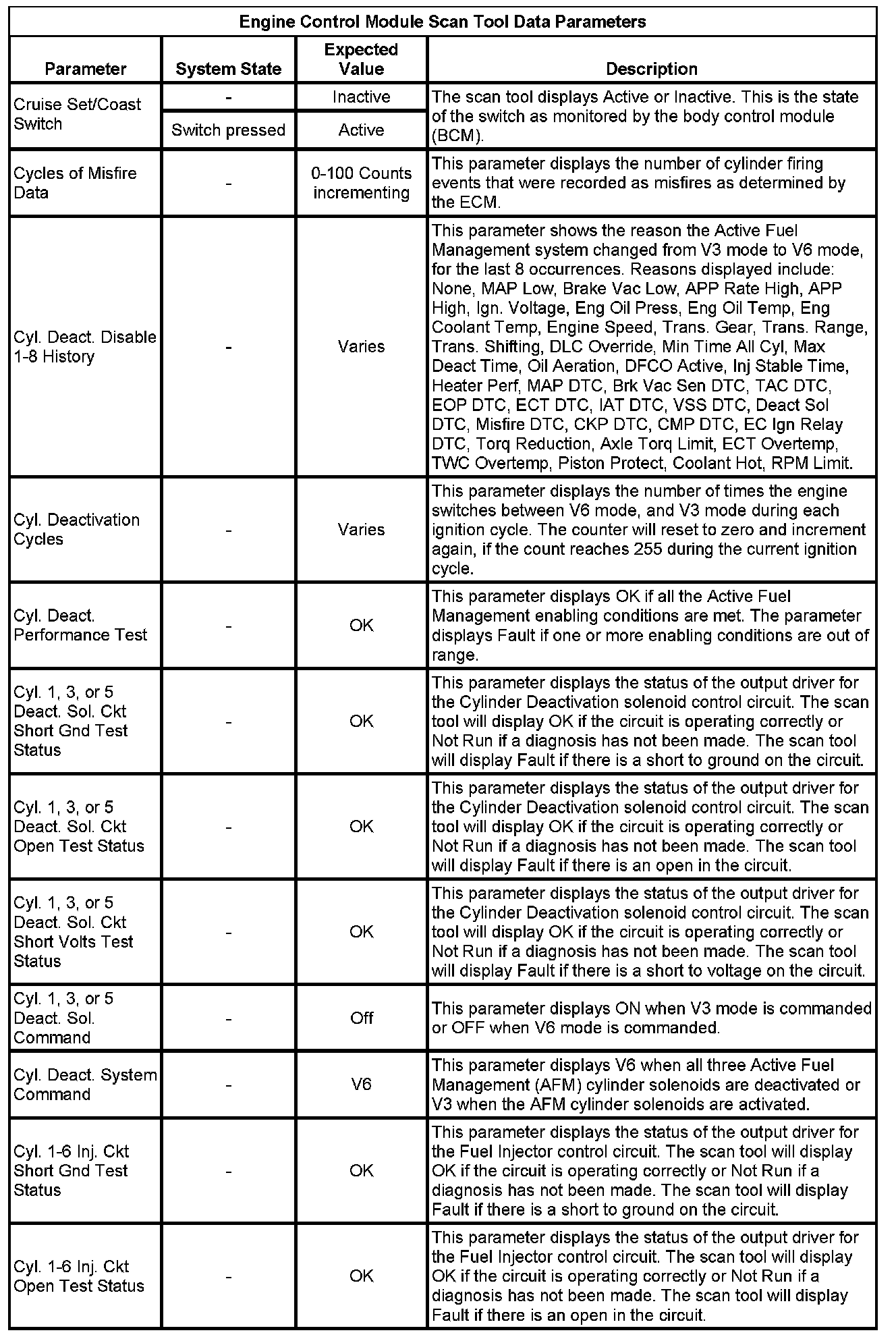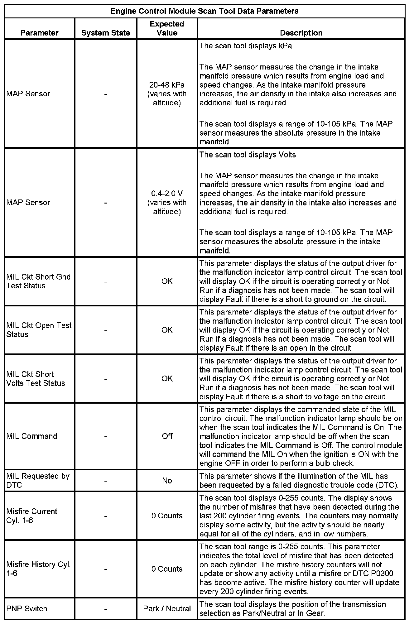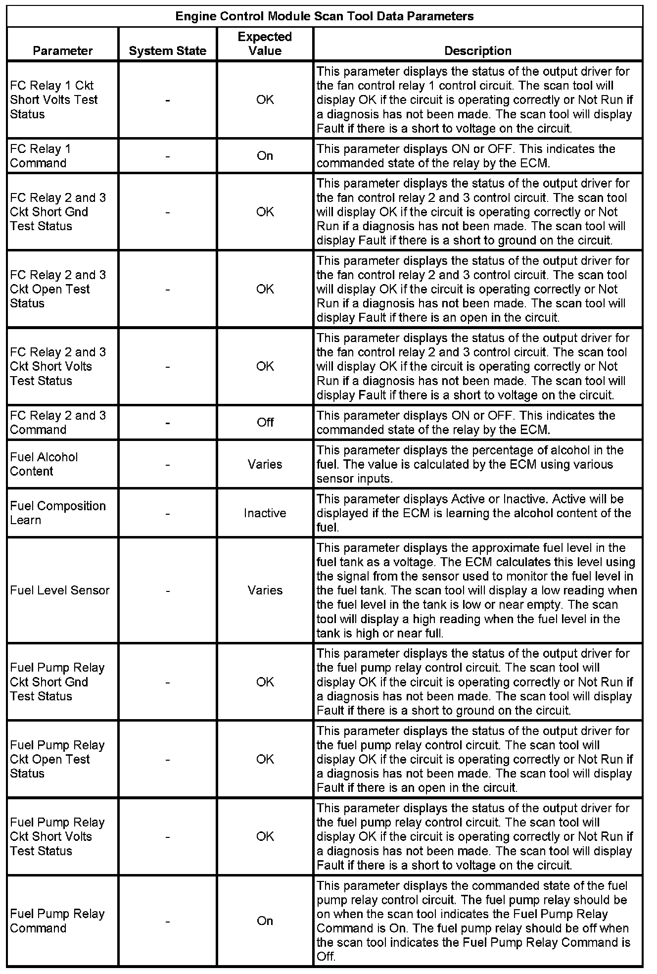 The Engine Control Module Scan Tool Data List contains all engine-related parameters that are available on the scan tool. The list is arranged in alphabetical order. A given parameter may appear in any one of the data lists, and in some cases may appear more than once, or in more than one data list in order to group certain related parameters together.
