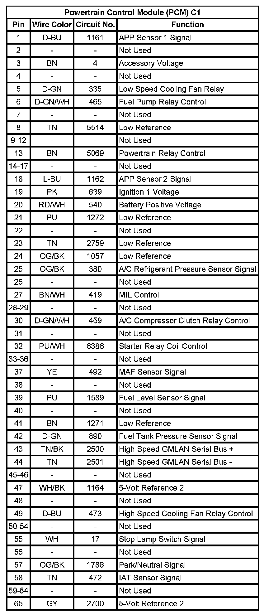 Powertrain Control Module (PCM) C1 (Pin 1 To 65):
