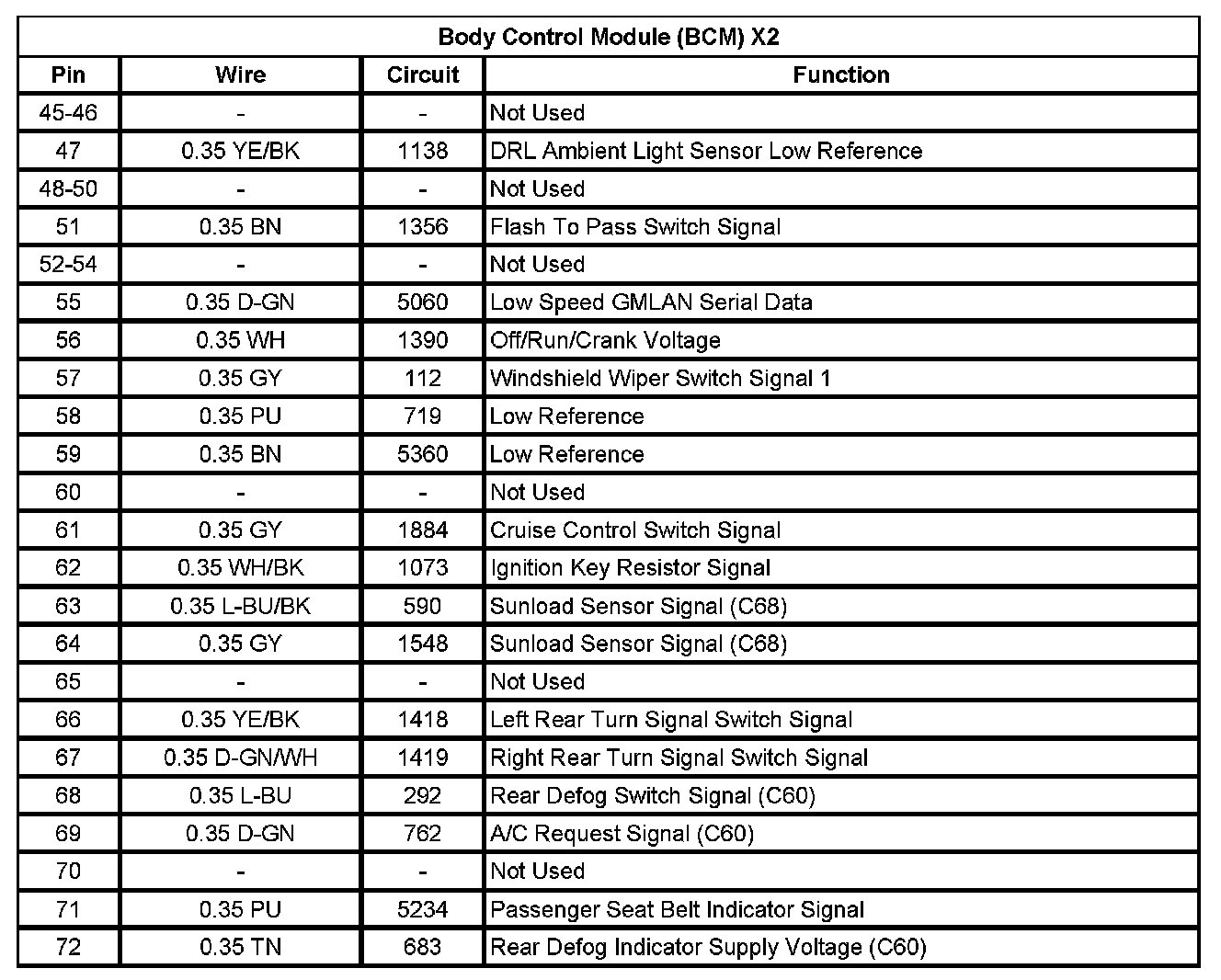 Body Control Module (BCM) X1 (Pin 45 To 72):