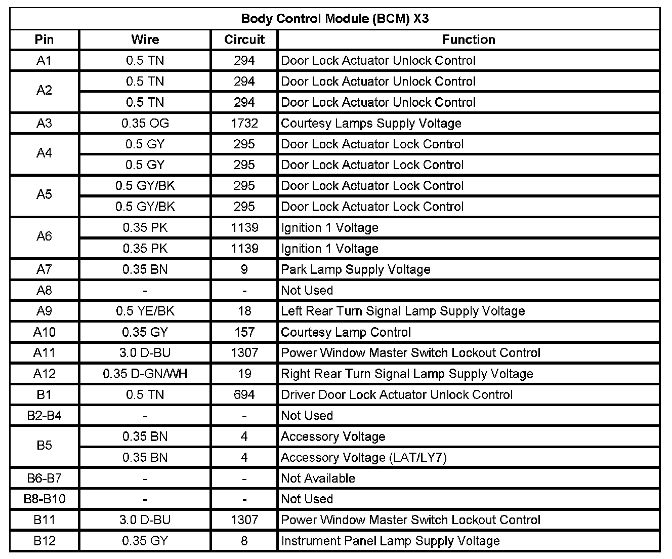 Body Control Module (BCM) X3 (Pin A1 To B12):