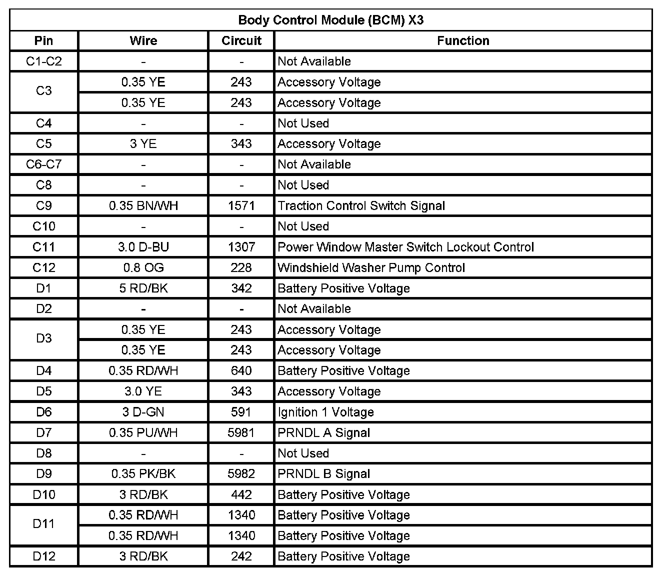 Body Control Module (BCM) X3 (Pin C1 To D12):