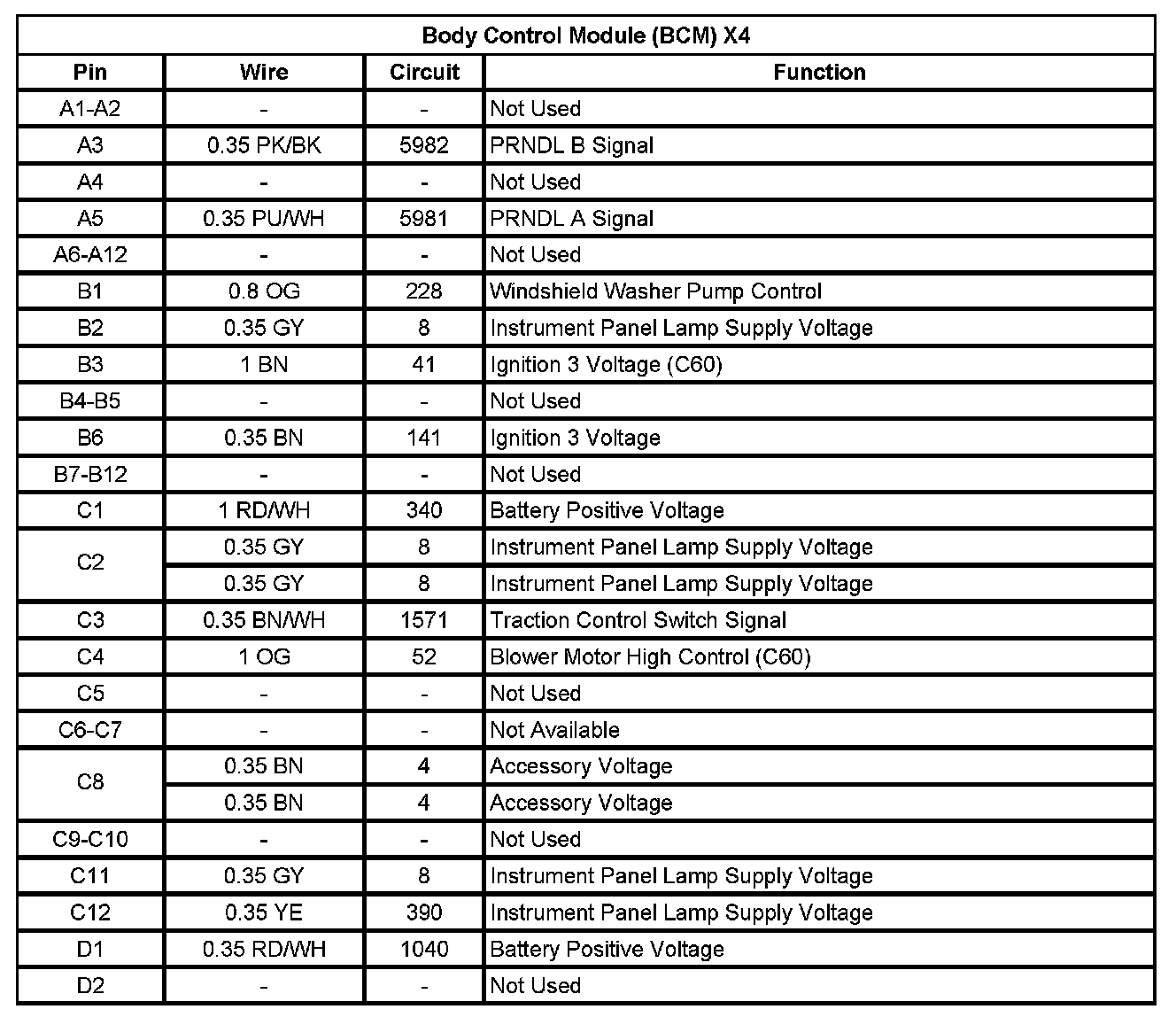 Body Control Module (BCM) X4 (Pin A1 To D2):
