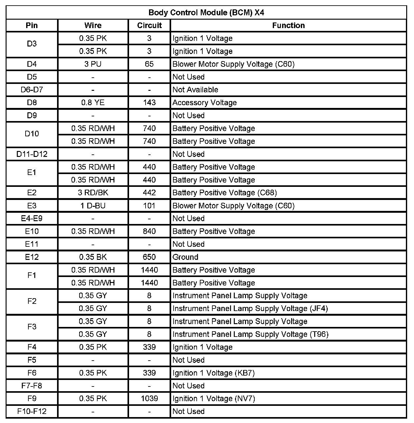 Body Control Module (BCM) X4 (Pin D3 To F12):