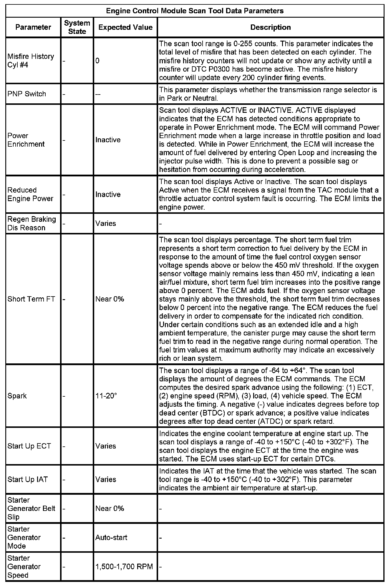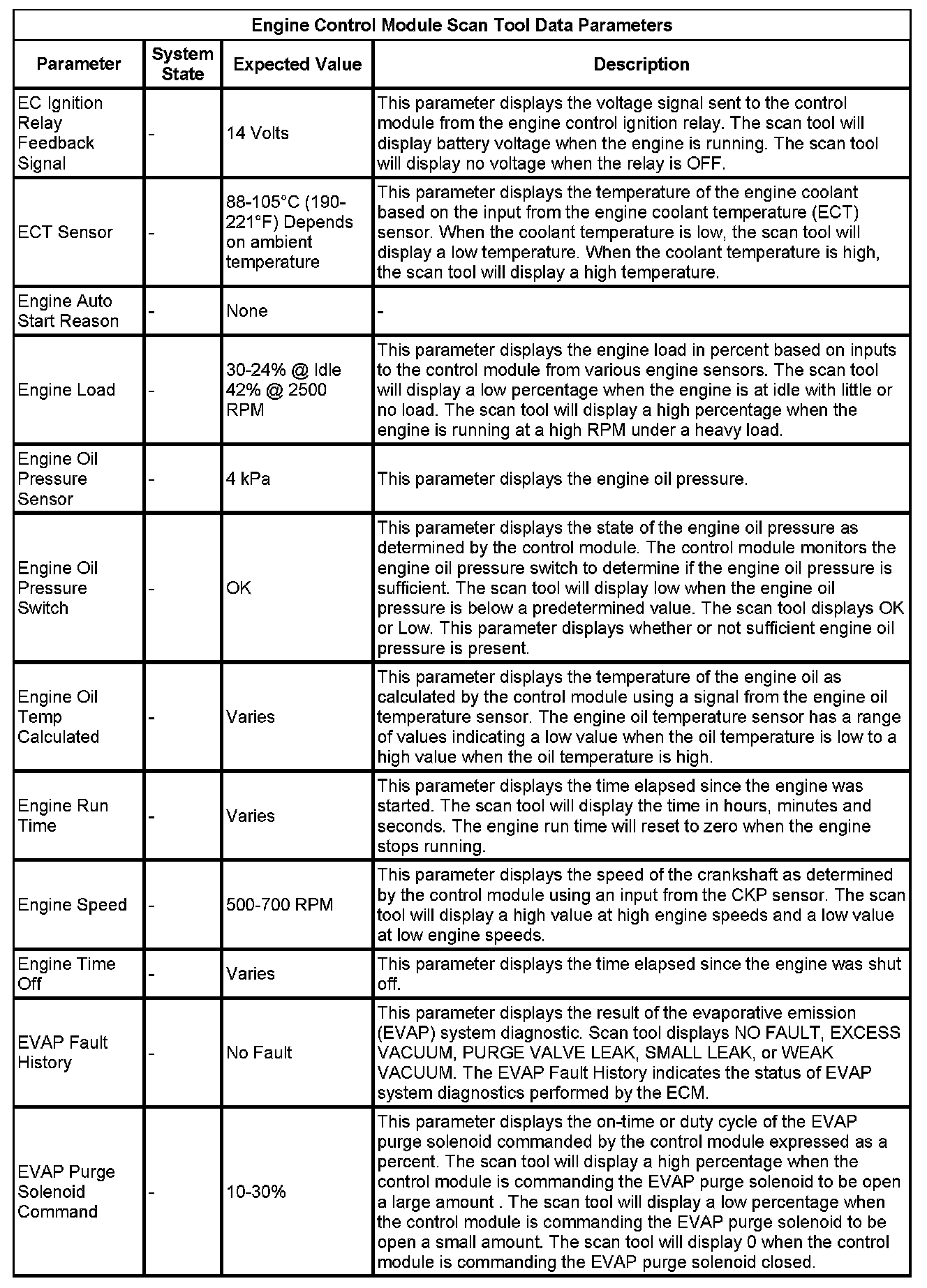 The Engine Scan Tool Data List contains all engine related parameters that are available on the scan tool. The list is arranged in alphabetical order.