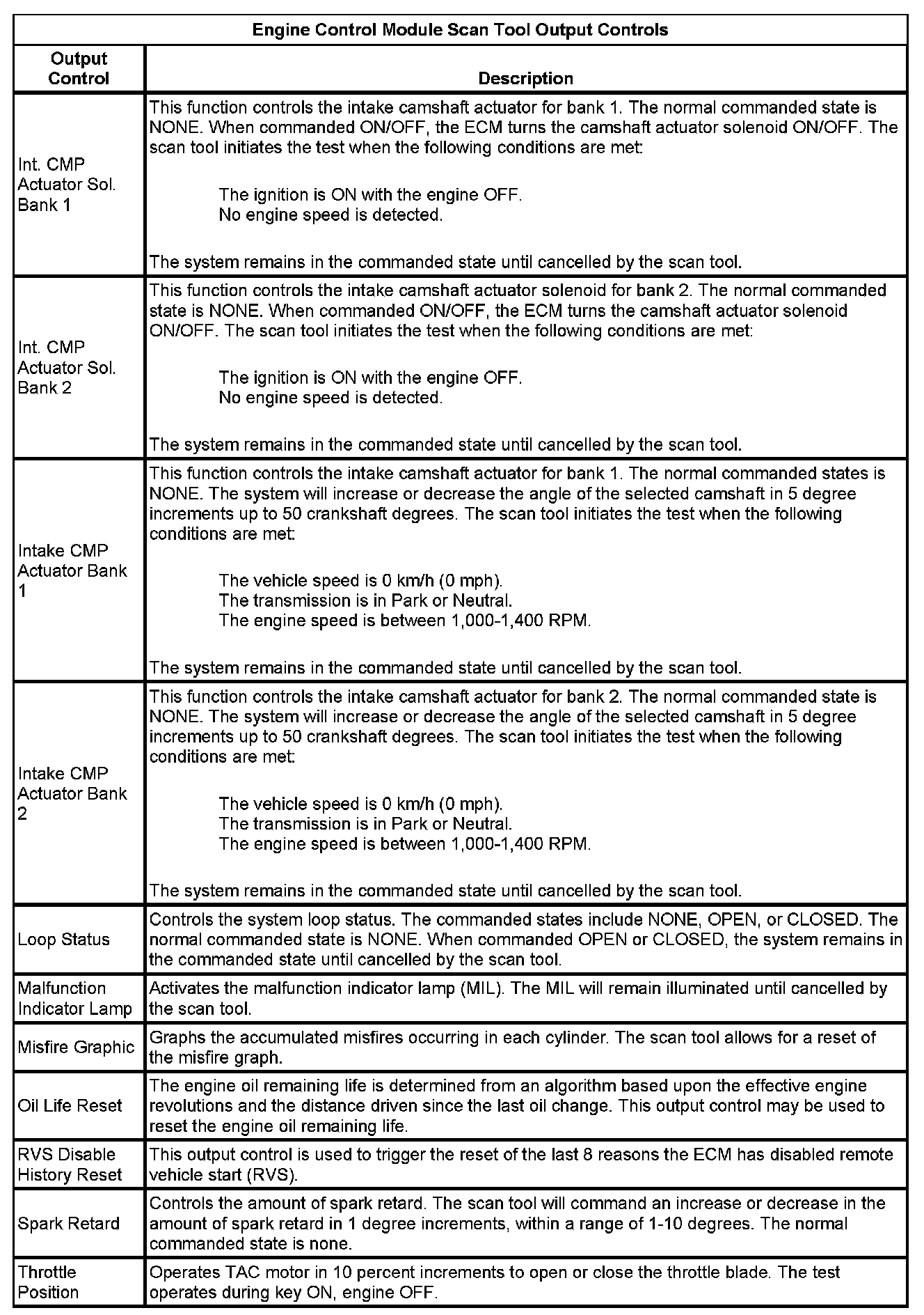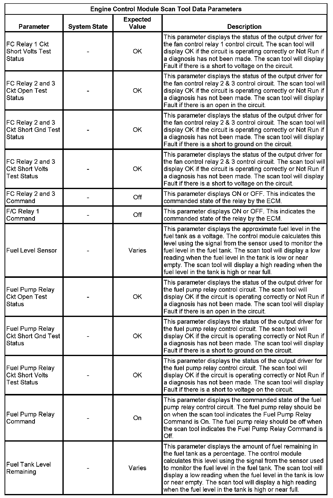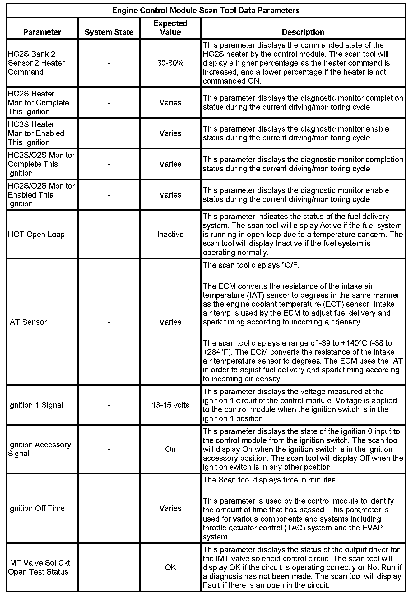 The Engine Control Module Scan Tool Data List contains all engine-related parameters that are available on the scan tool. The list is arranged in alphabetical order. A given parameter may appear in any one of the data lists, and in some cases may appear more than once, or in more than one data list in order to group certain related parameters together.