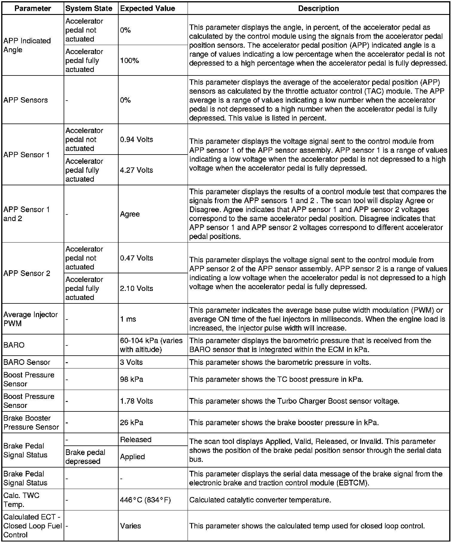 Only the parameters listed below are referenced in this service manual for use in diagnosis. If all values are within the typical range described below, refer to Symptoms - Engine Controls (- Symptoms - Engine Controls) for the 2.0L engine for diagnosis.