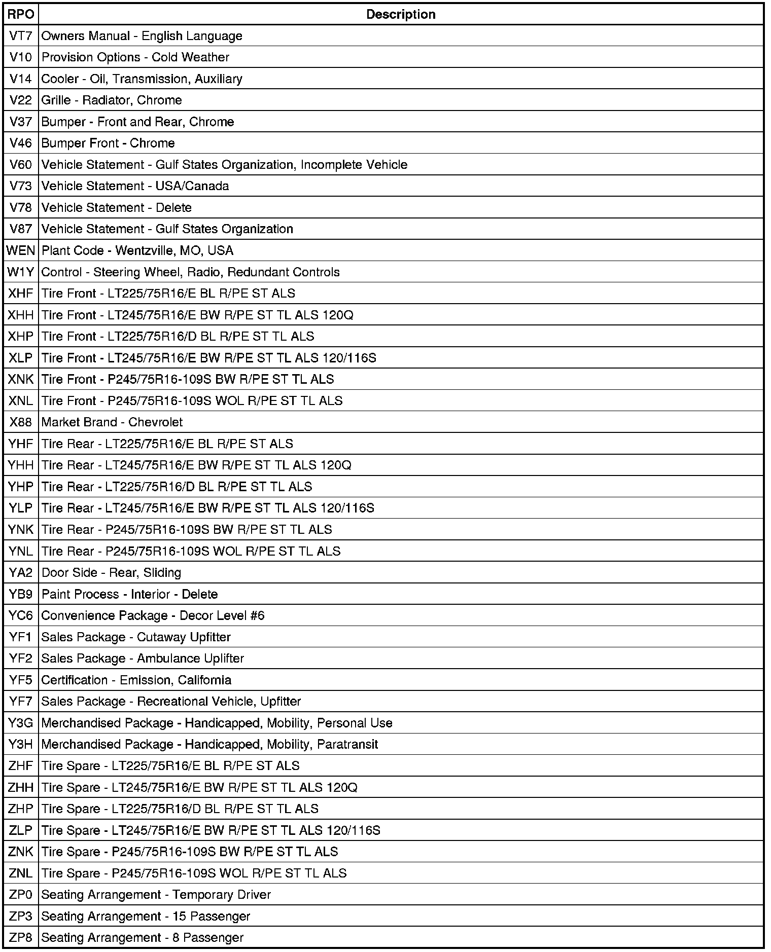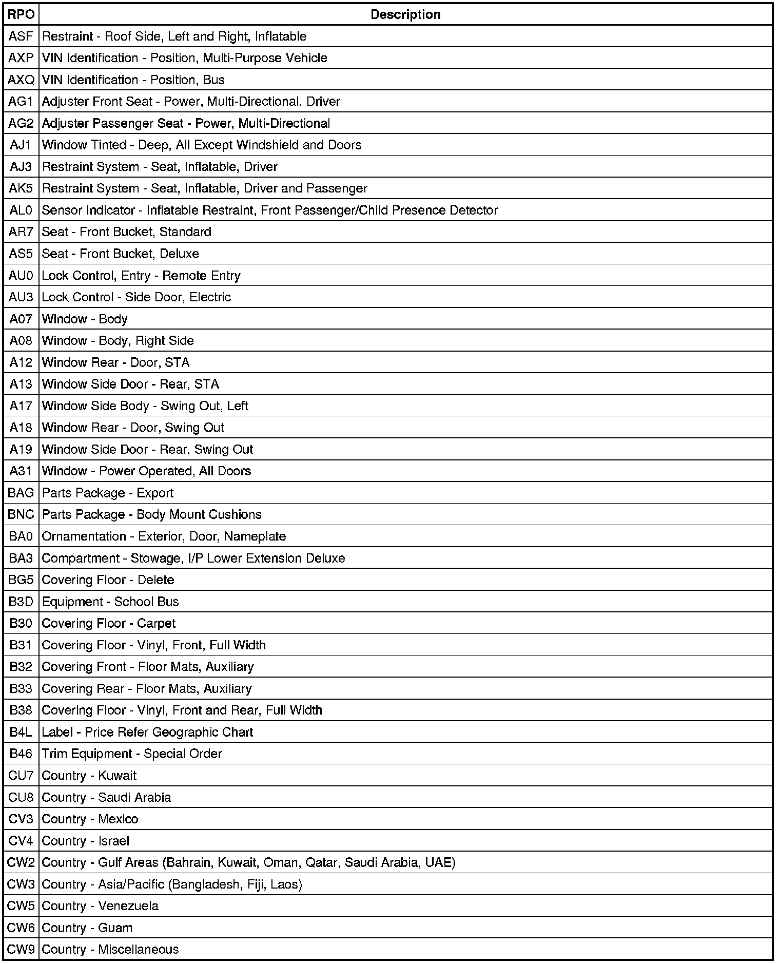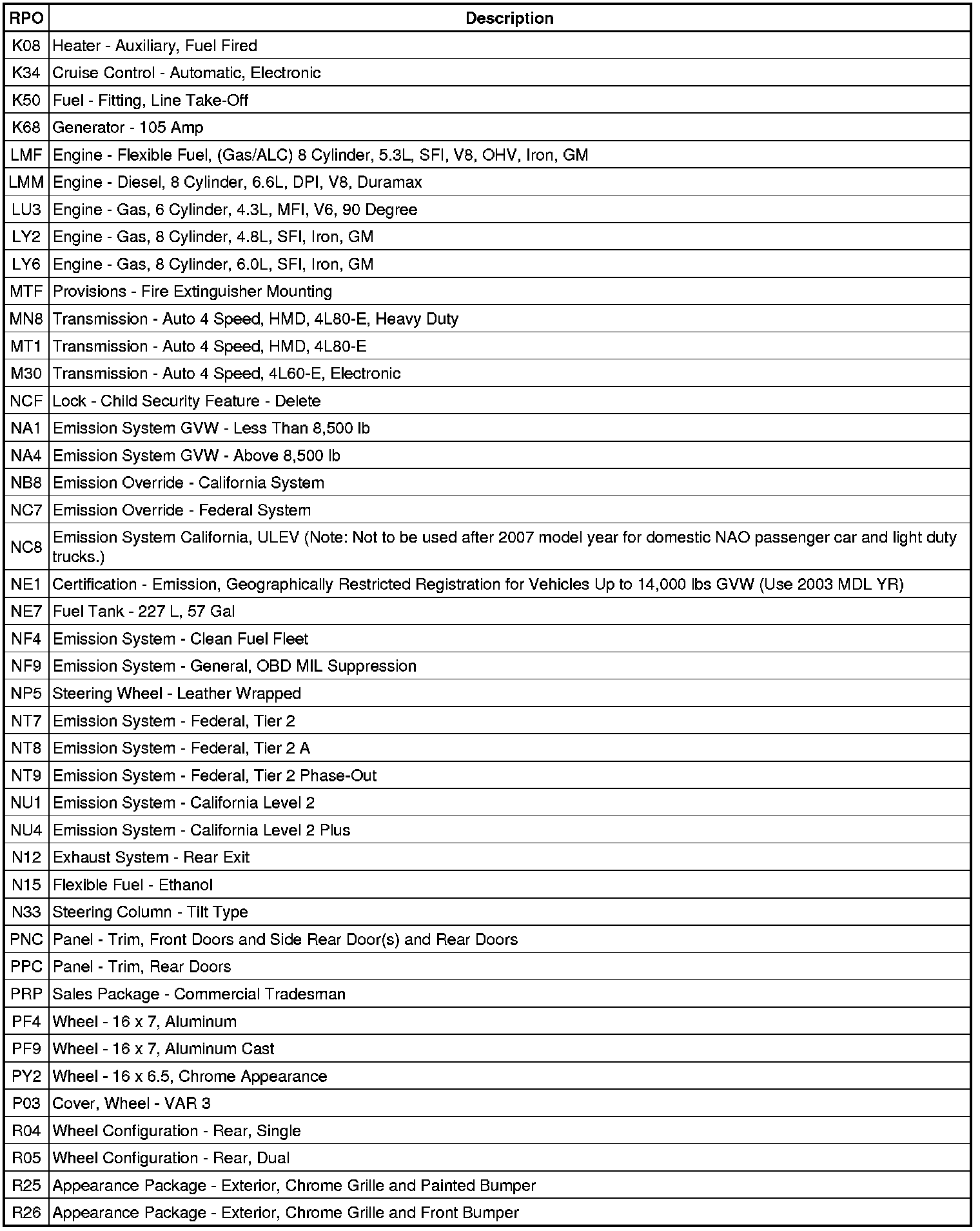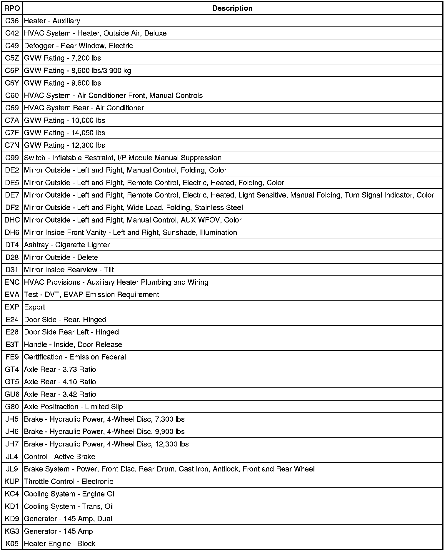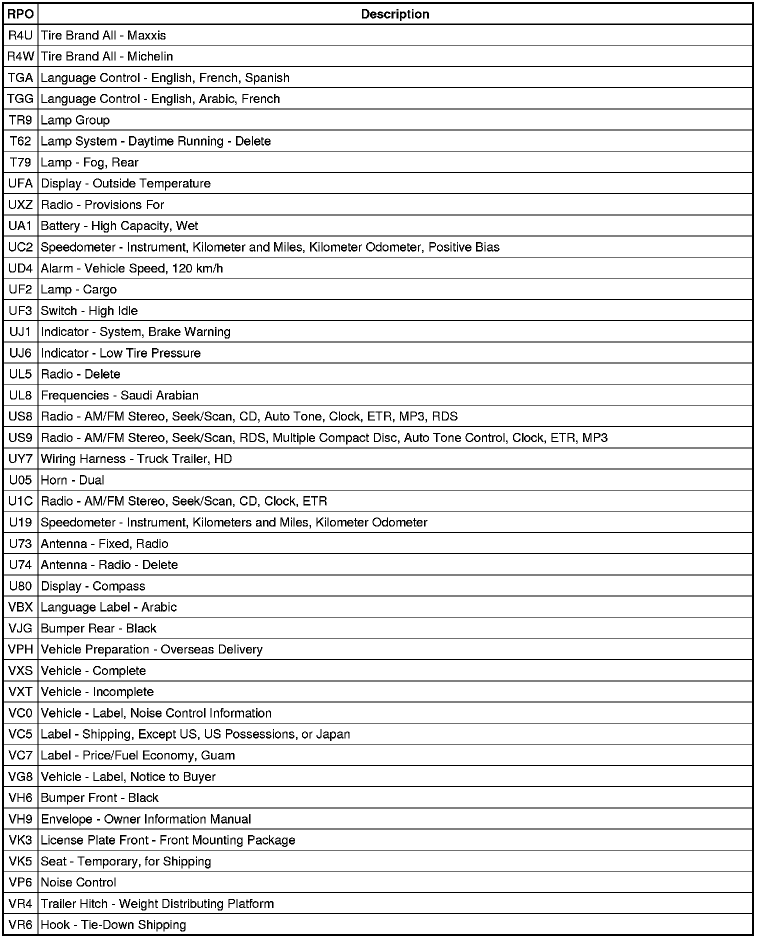RPO Code List