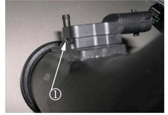 Inspect the TMAP sensor when mounted on the charge air duct. Note how the TMAP sensor is not mounted flush on the duct (1).