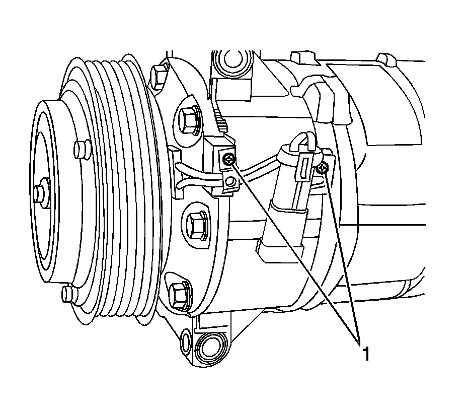 3. Remove the A/C compressor clutch assembly wiring harness retaining screws (1).