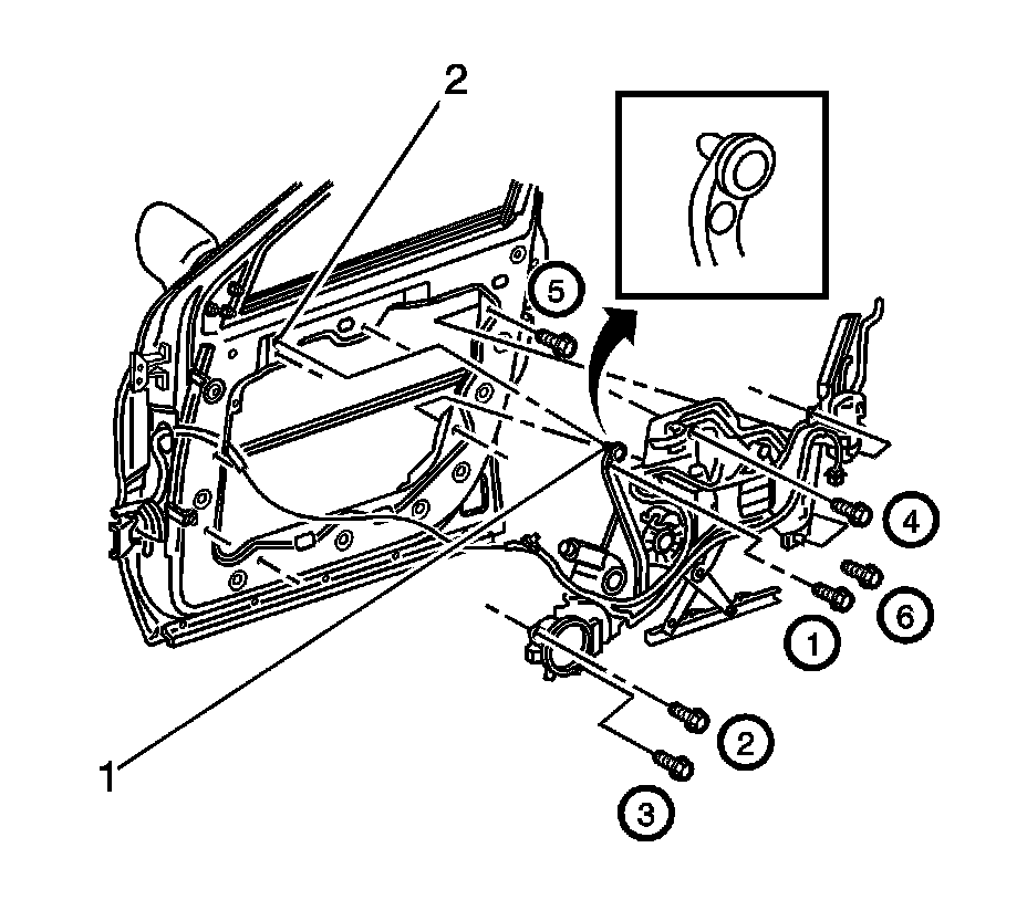 4. Install the 3 (1) door to latch (2) screws and tighten, in sequence as shown, to 10 Nm (89 lb in).