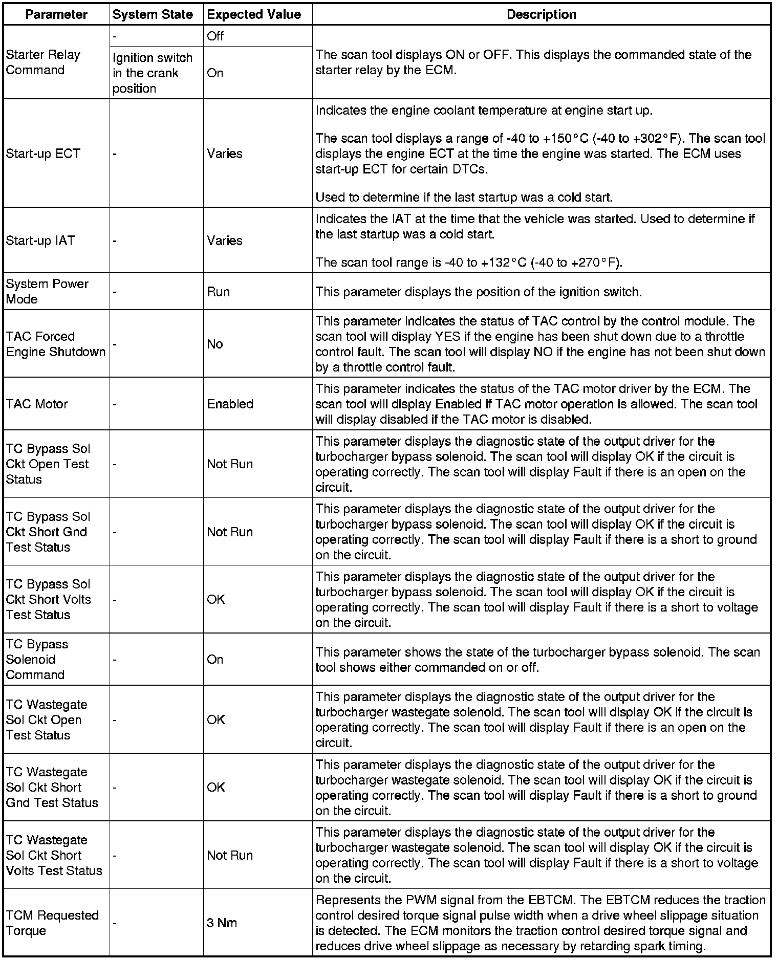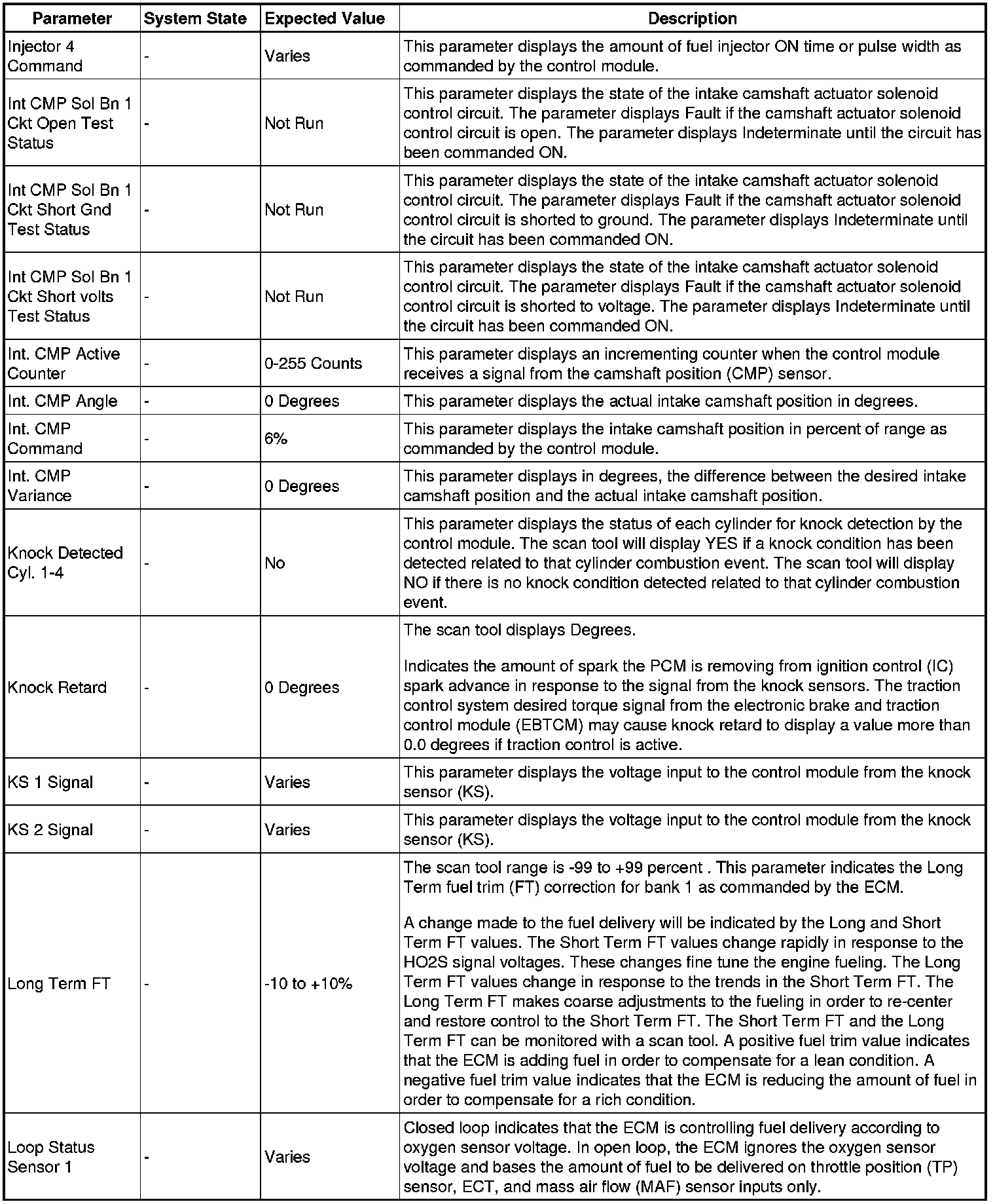 Only the parameters listed below are referenced in this service manual for use in diagnosis. If all values are within the typical range described below, refer to Symptoms - Engine Controls (Symptoms - Engine Controls) for the 2.0L engine for diagnosis.