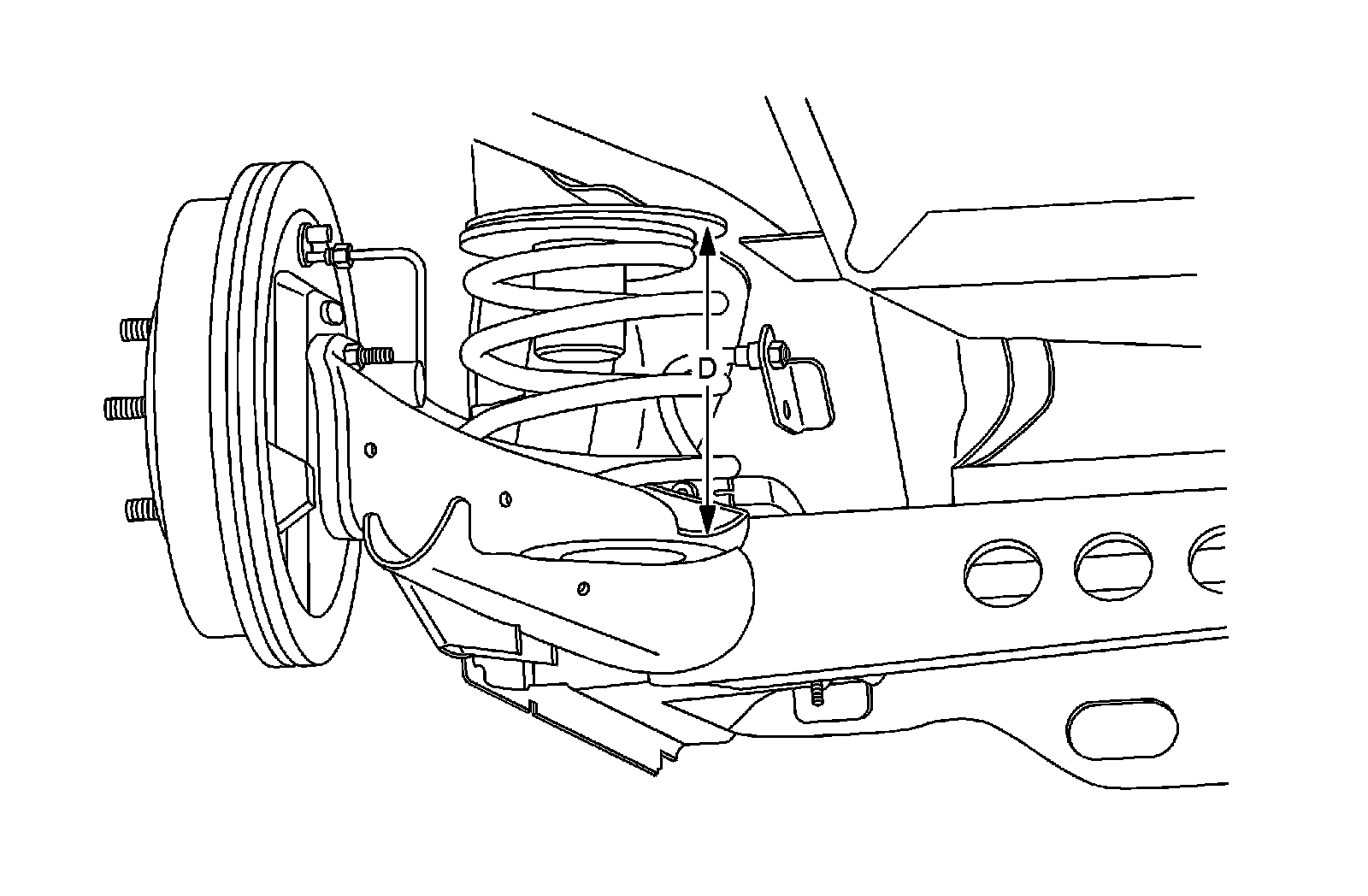 The D height dimension measurement determines the proper rear end ride height. There is no adjustment procedure. Repair may require replacement of suspension components.