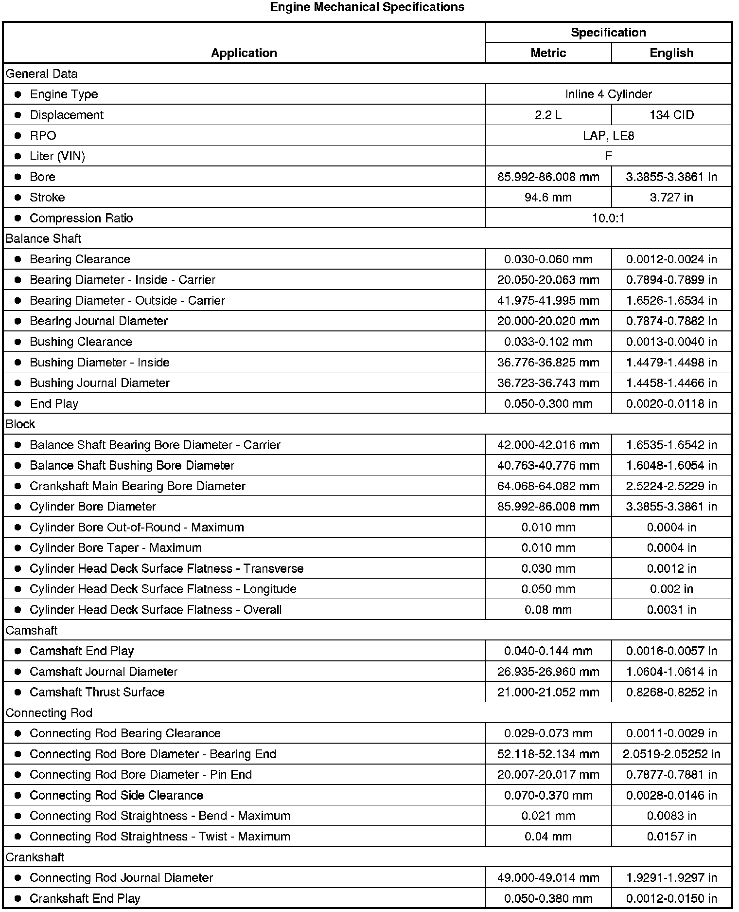Engine Mechanical Specifications (LAP, LE8)