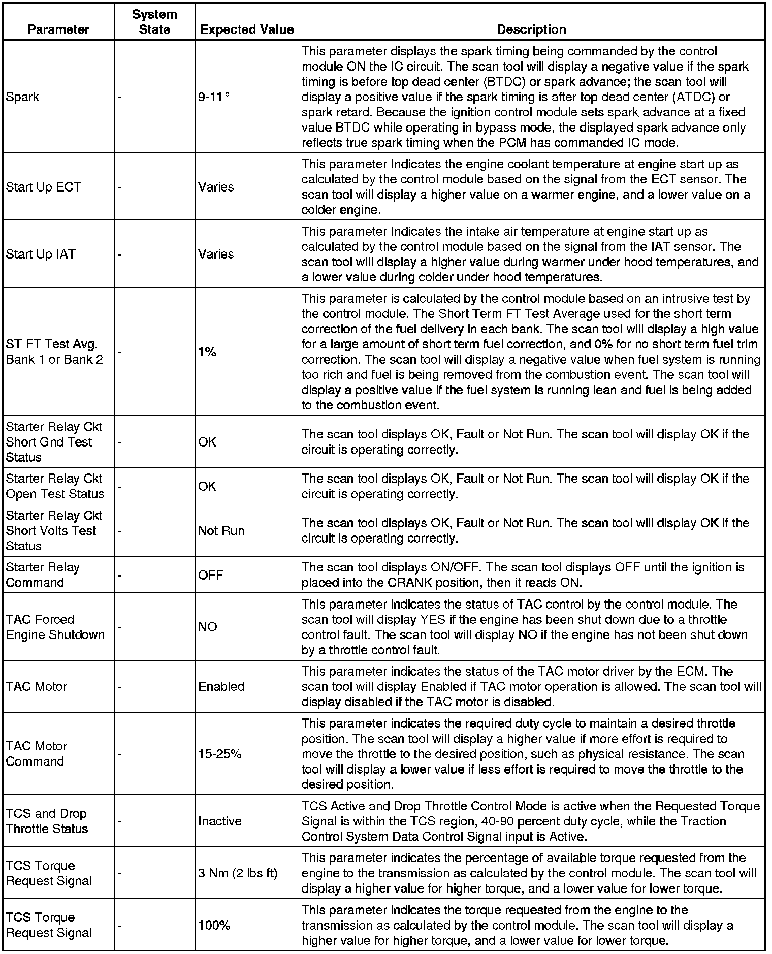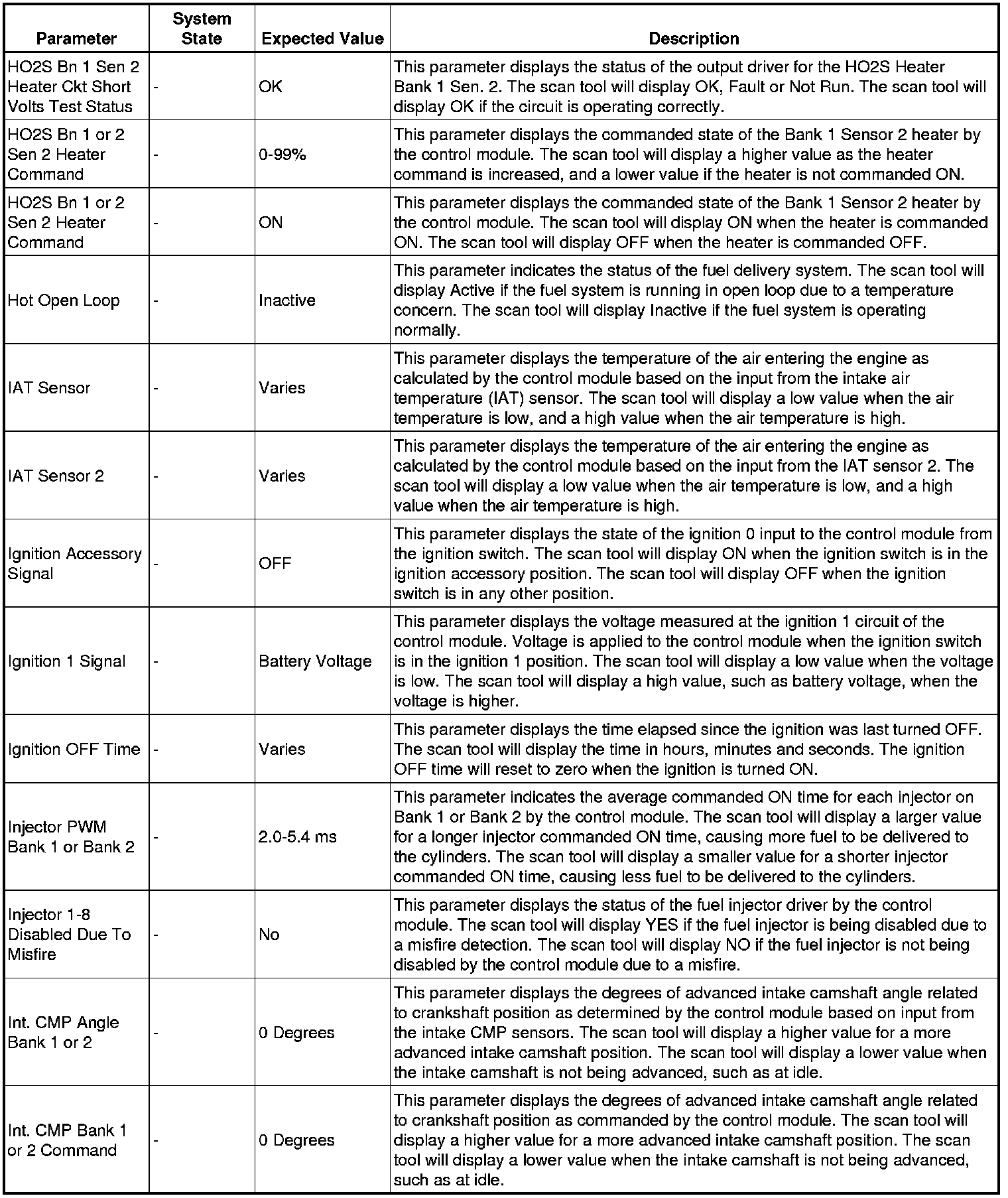 The scan tool values from a properly running engine may be used for comparison with the engine you are diagnosing. The engine scan tool data list represents values that would be seen on a normally running engine.