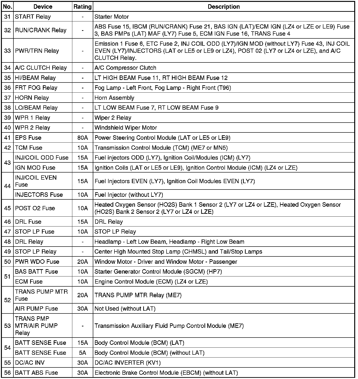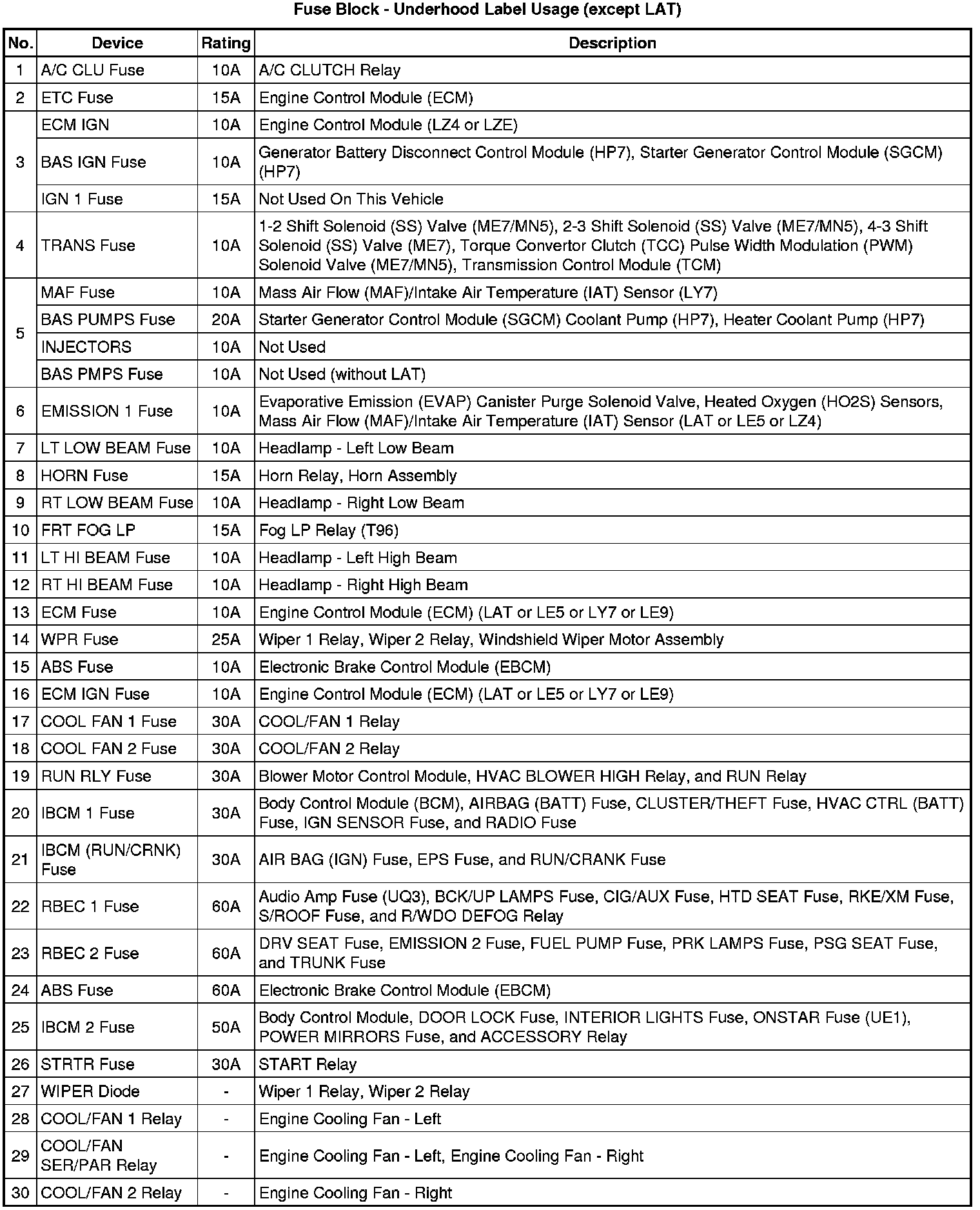 Fuse Block - Underhood Label (except LAT)