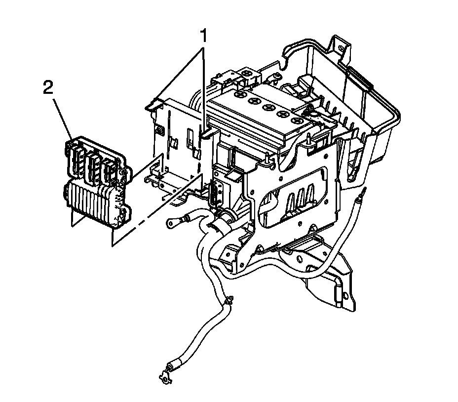 1. Set the ECM (2) into the bottom of the bracket and push the ECM towards the battery until the ECM snaps into place and is secured by the retainers (1).