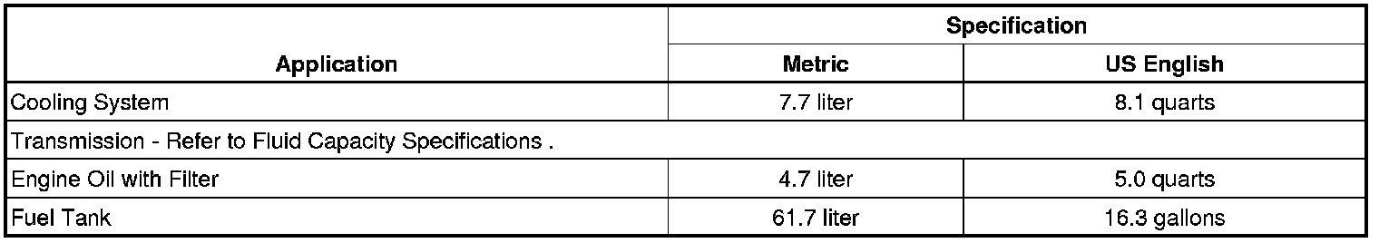 The following approximate capacities are given in US English and metric conversions. See Fluid and Lubricant Recommendations (Maintenance) for more information. All capacities are approximate. When adding, be sure to fill to the approximate level, as recommended in this manual. Recheck fluid level after filling.