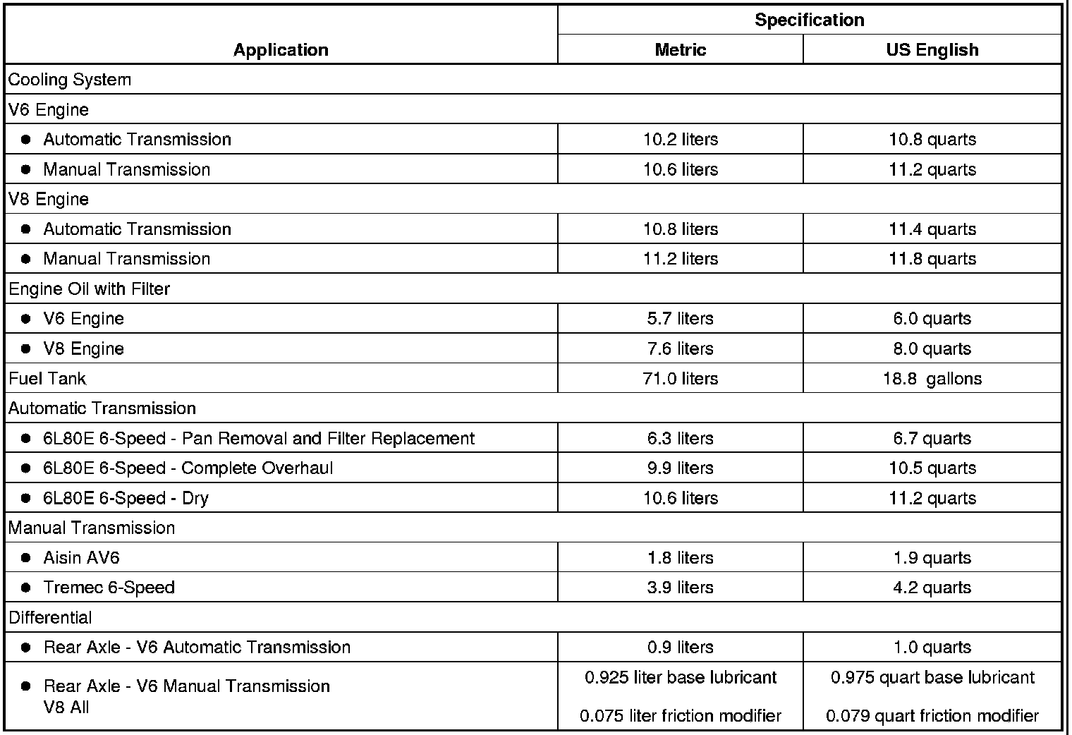 The following approximate capacities are given in US English and metric conversions. See Fluid and Lubricant Recommendations (Maintenance) , for more information. All capacities are approximate. When adding, be sure to fill to the approximate level, as recommended in this manual. Re-check fluid level after filling.