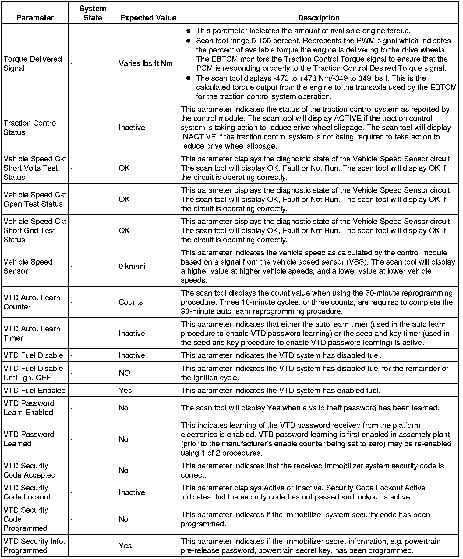 Only the parameters listed below are referenced in this service manual for use in diagnosis.