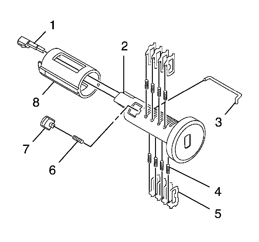 Note: The tumblers (5) are not self-retaining and must be held in place if the key is not fully inserted into the lock cylinder or until the cylinder (2) is assembled into the case assembly (8).