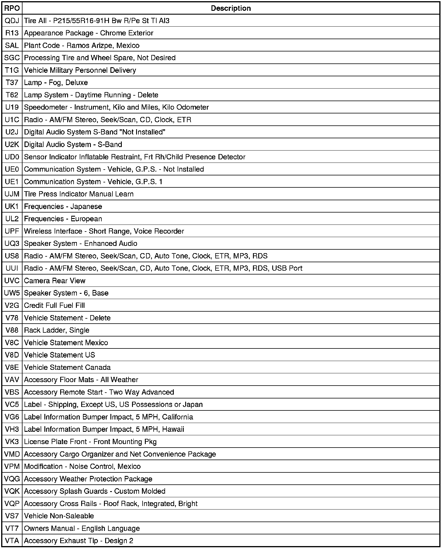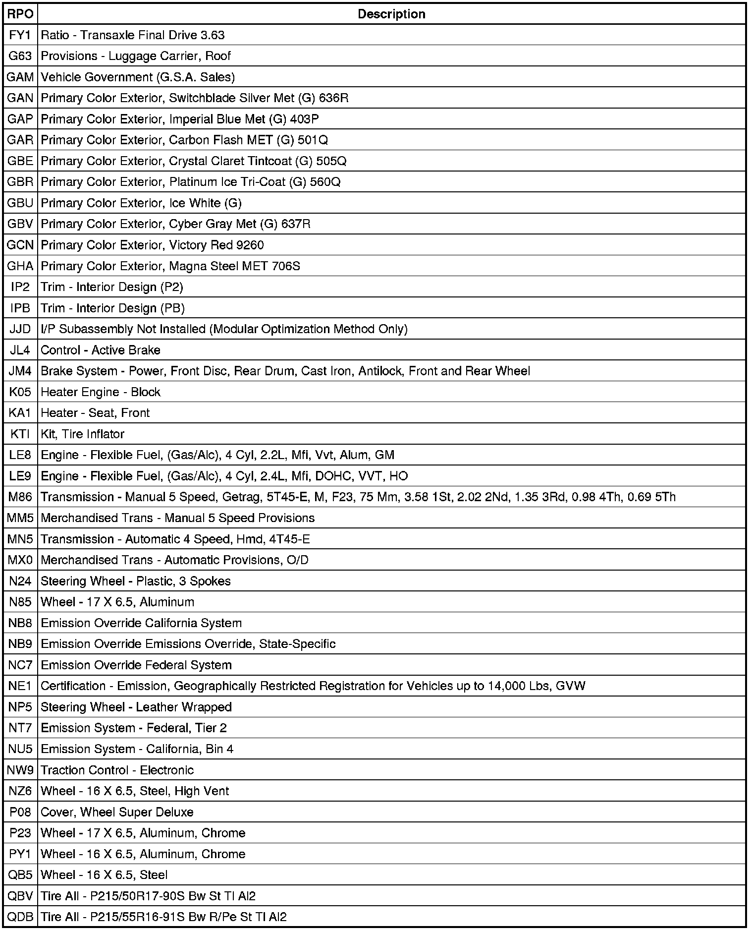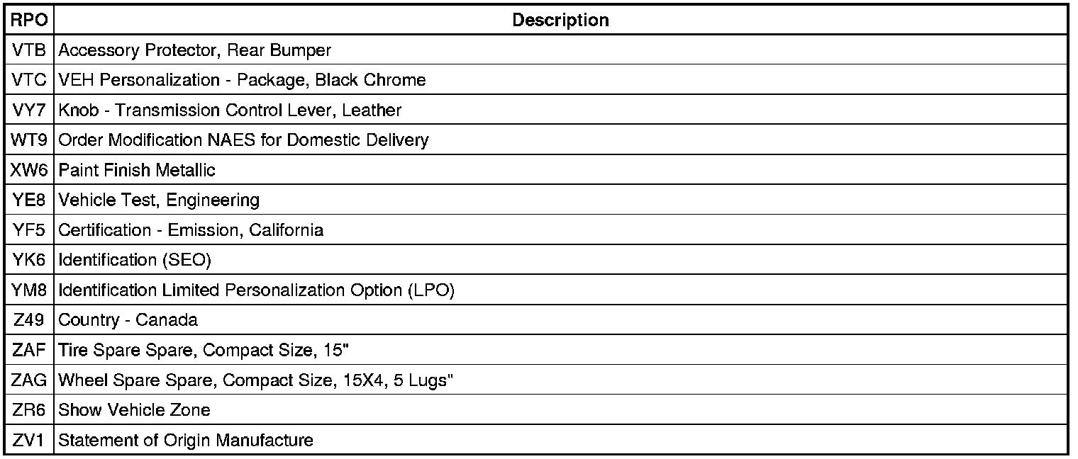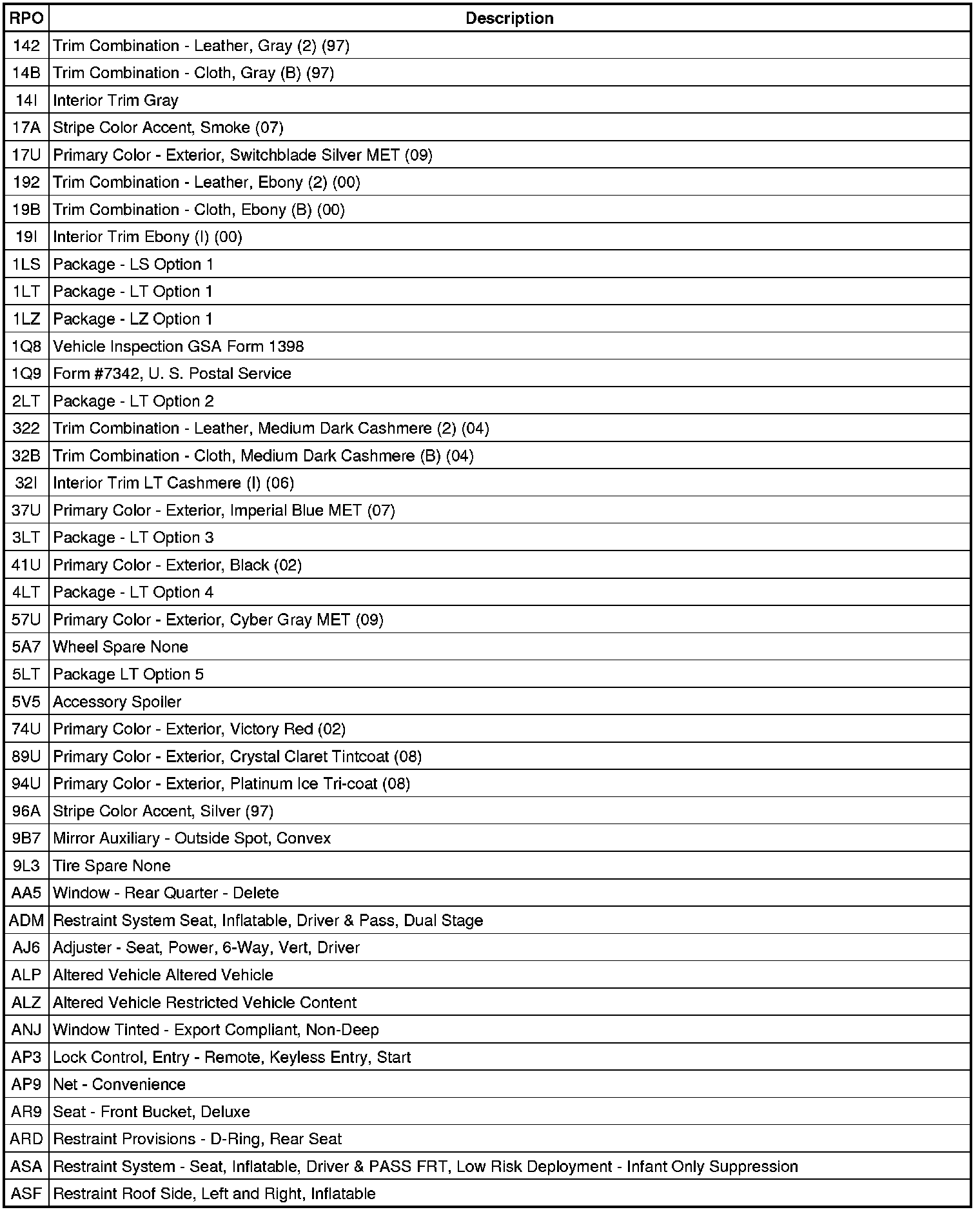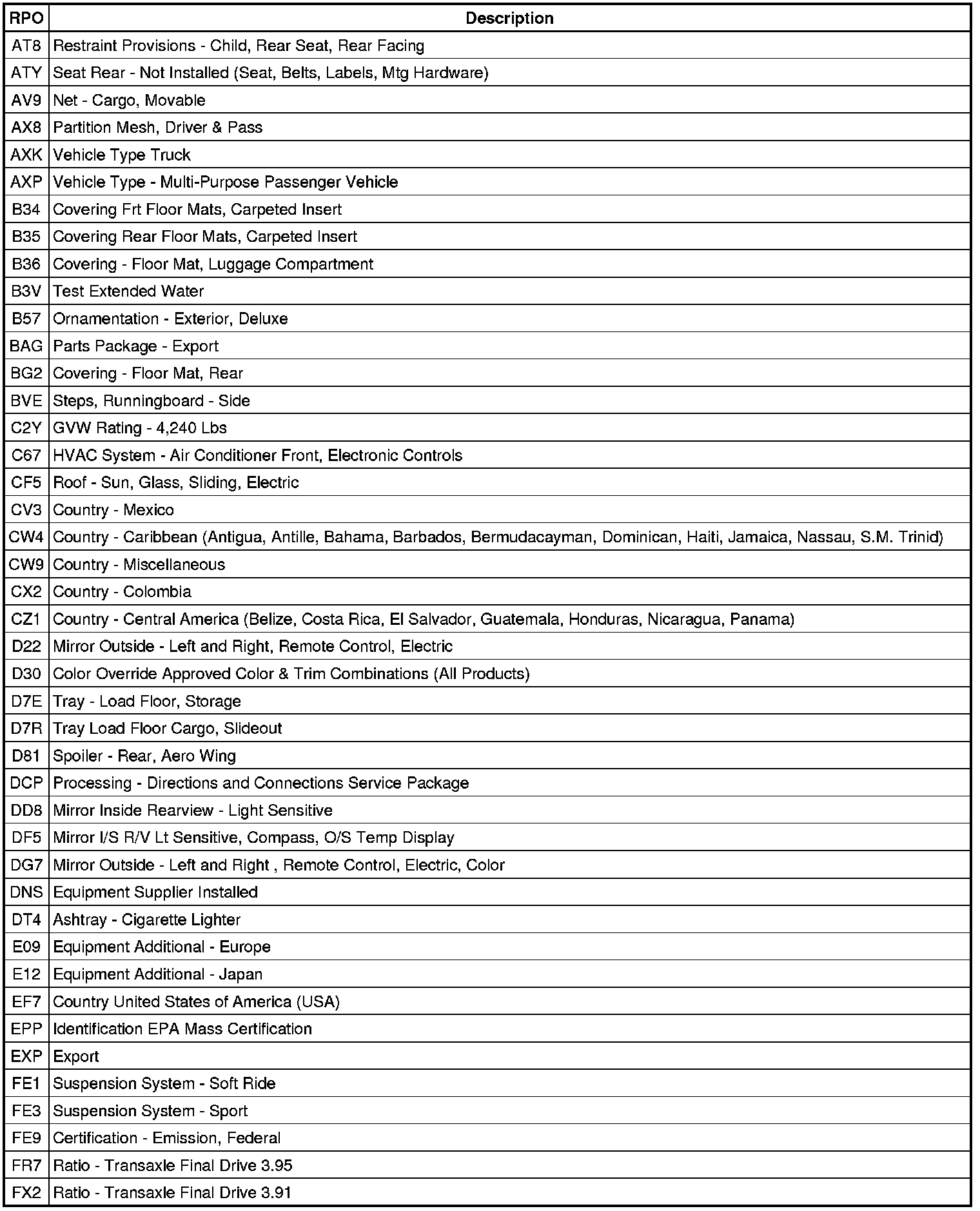 RPO Code List