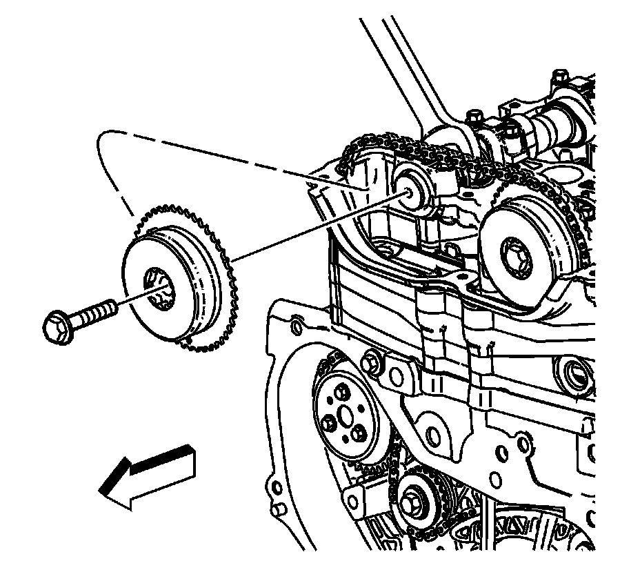 Note: Ecotec 4 cylinder engines with SIDI-Direct Injection, the lower timing chain crank gear may be equipped with a second spacing washer installed in front of the lower timing chain crank gear. The outer spacer/washer is in between the crank/balancer pulley and the lower timing gear and may remain in place when the pulley is removed. The spacer/washer has a dot/mark on its surface that may be mistaken for the lower timing mark. If applicable, the washer must be removed in order to view the correct timing mark on the lower crank gear.