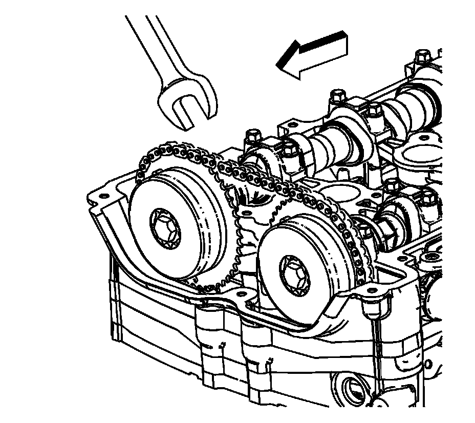 7. Install a 24 mm wrench on the hex on the exhaust camshaft in order to hold the camshaft.