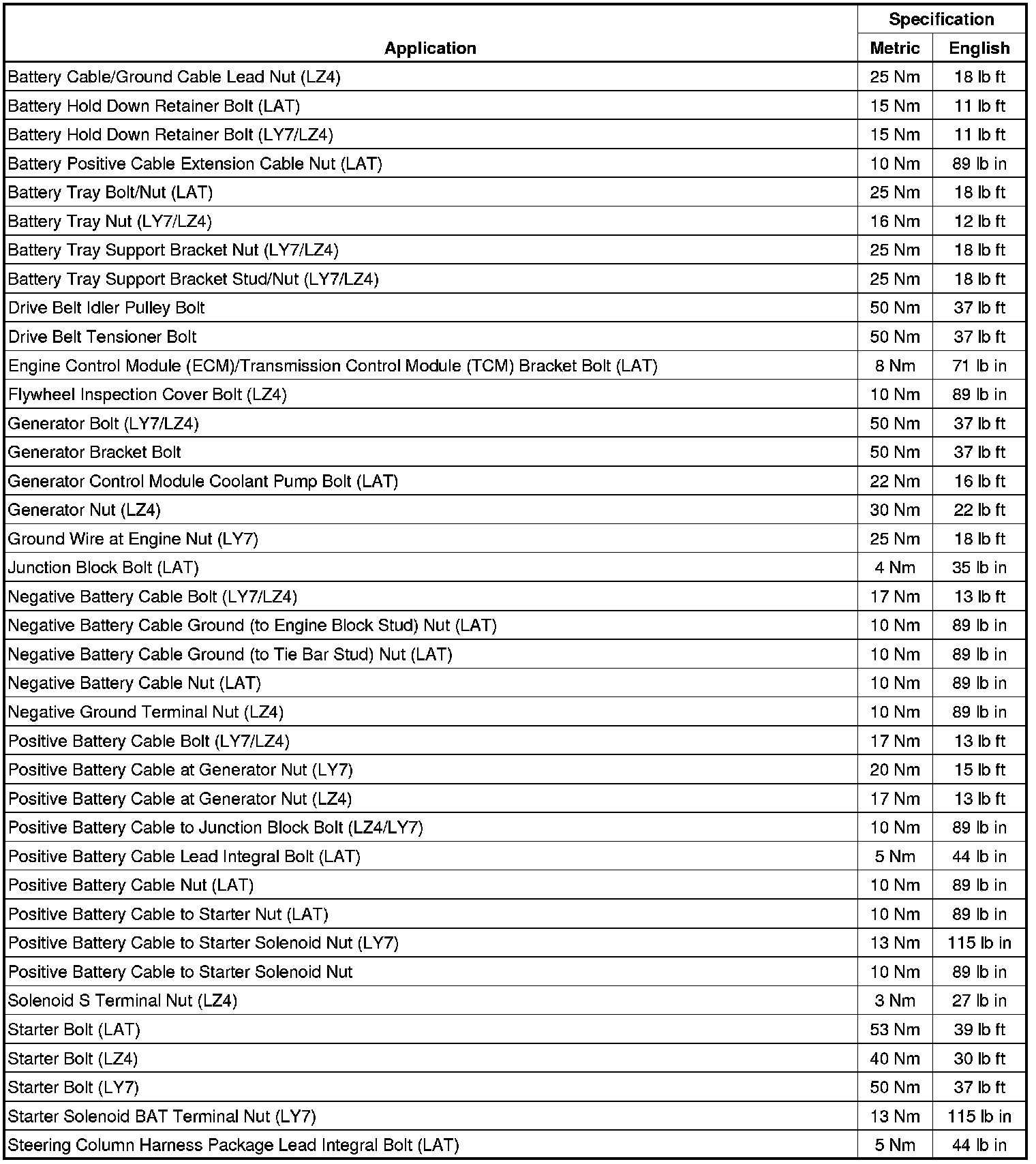 Starting and Charging: Specifications