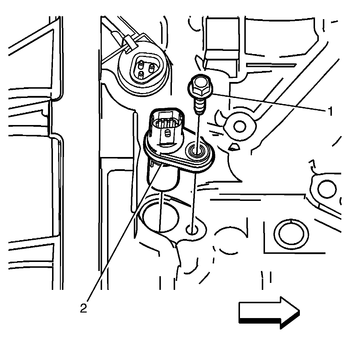4. Remove the CKP to engine block retaining bolt♦(1) from the CKP sensor♦(2).