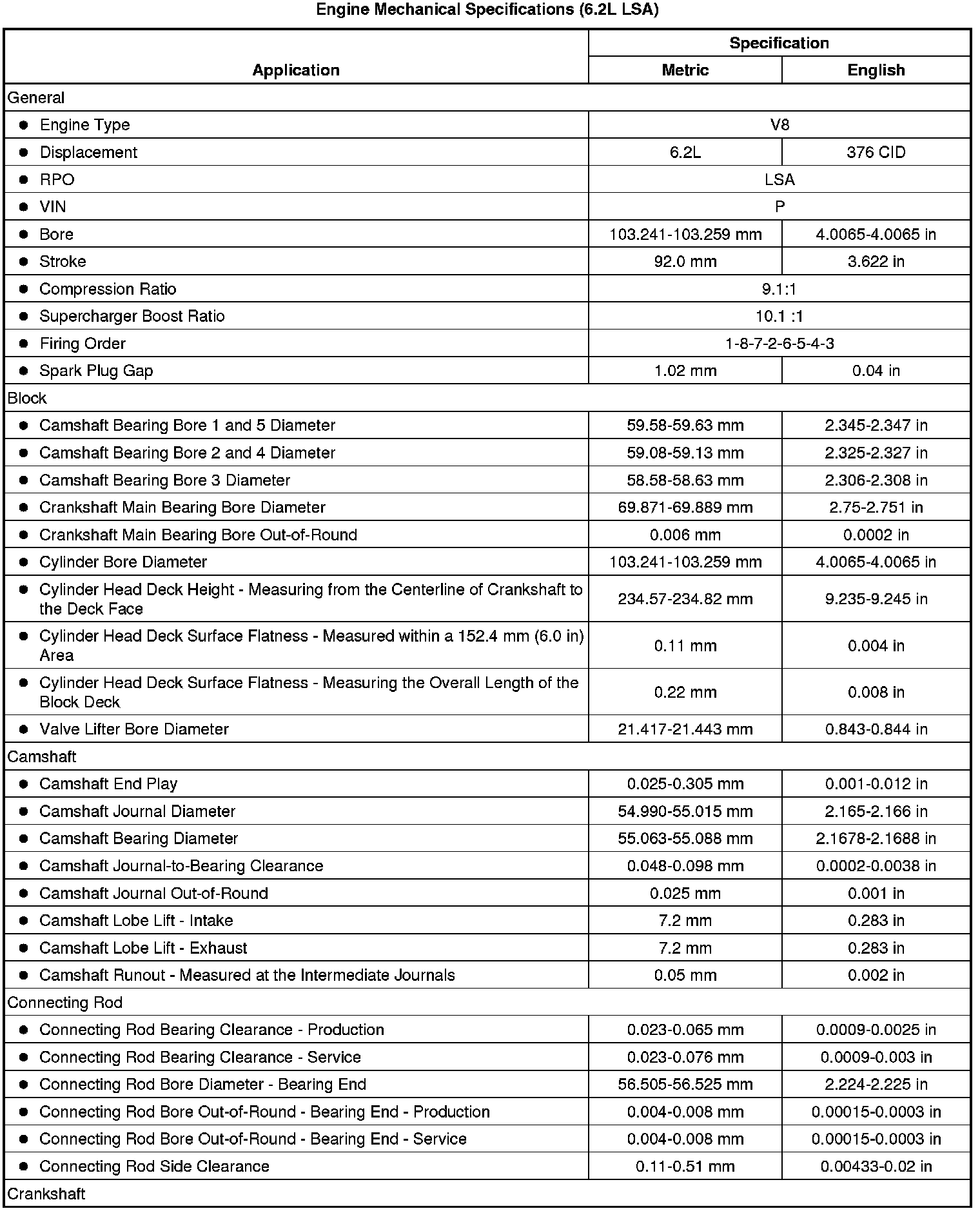 Engine Mechanical Specifications (6.2L LSA)
