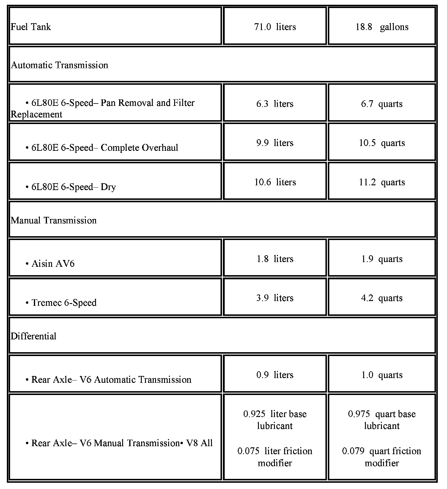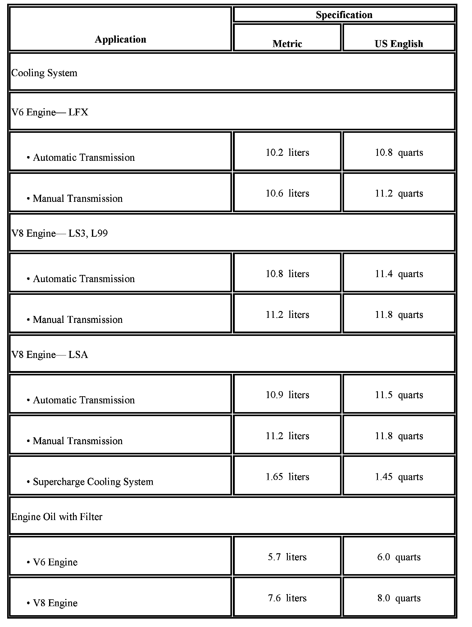 The following approximate capacities are given in US English and metric conversions. See Fluid and Lubricant Recommendations (Maintenance) for more information. All capacities are approximate. When adding, be sure to fill to the approximate level, as recommended in this manual. Recheck fluid level after filling.