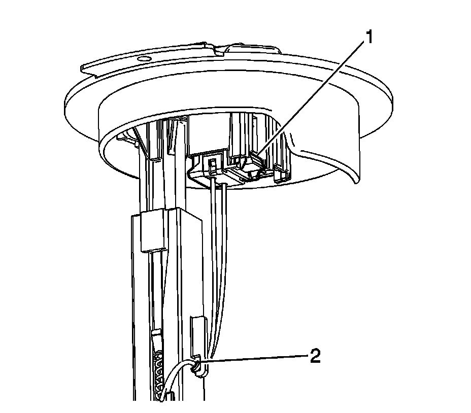 3. Remove the fuel level sensor wiring from the retaining feature (2) on the fuel tank fuel pump module.