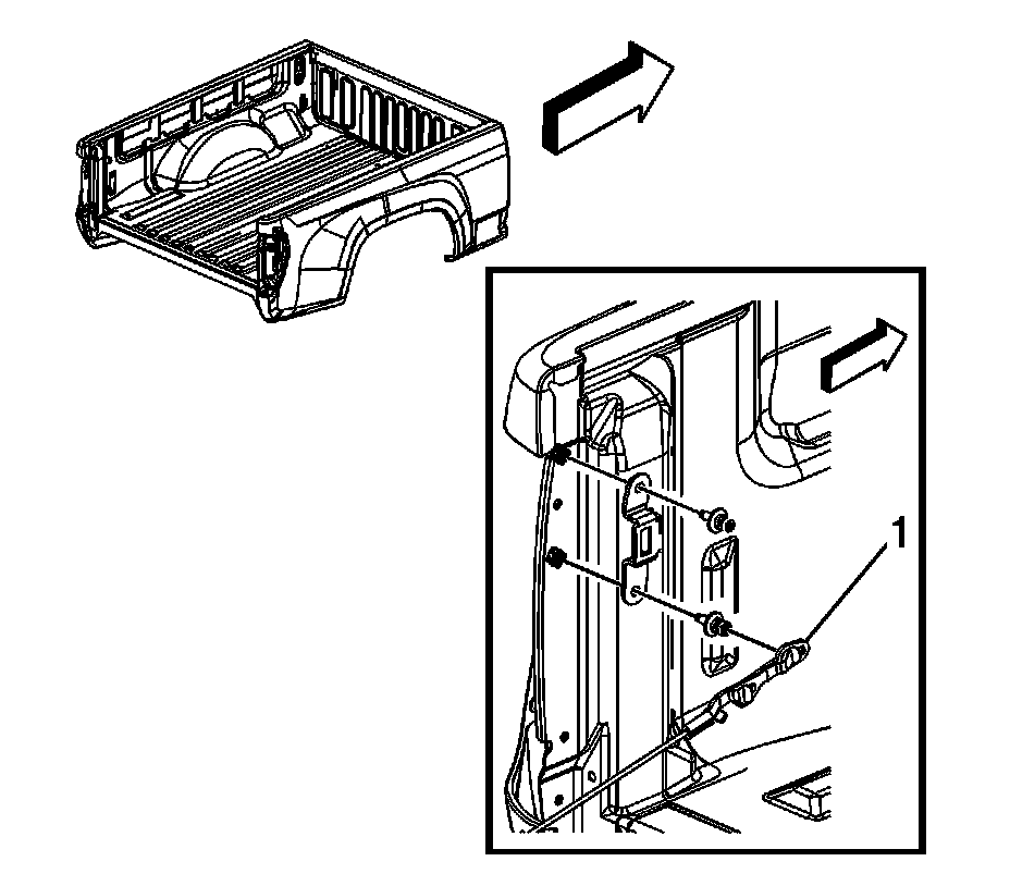 7. Install the support cables (1) onto the endgate striker bolt heads by inserting the keyhole slots over the bolt head and sliding the cable rearward.