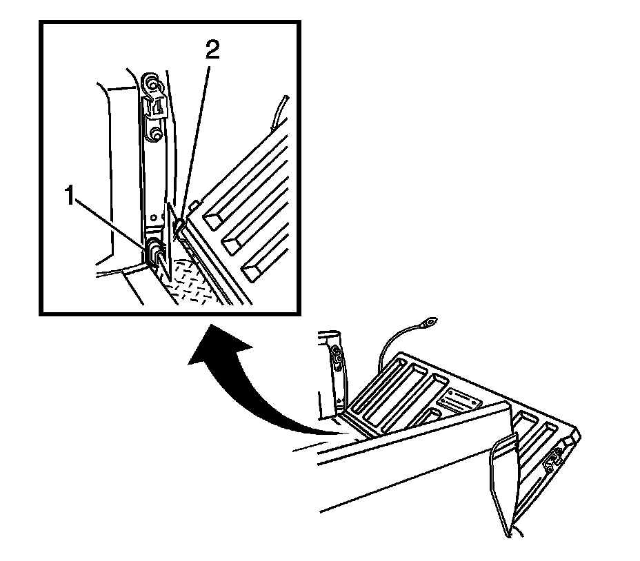 6. Install the endgate to the right body side hinge by holding the endgate at a 45 degree angle and lowering the endgate hinge (2) onto the body side hinge (1).