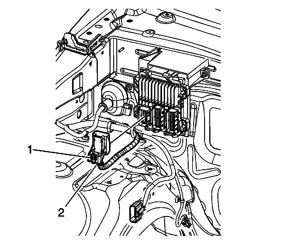7. Lift up the ECM bracket tabs (2) and tilt the ECM (1) towards the front of the vehicle, removing the ECM (1).