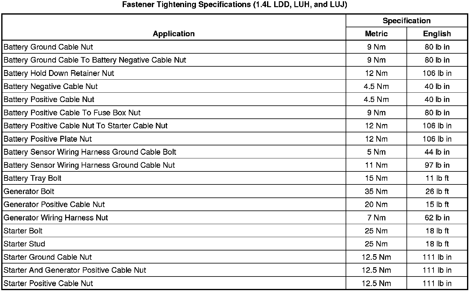 Fastener Tightening Specifications (1.4L LDD, LUH, and LUJ)