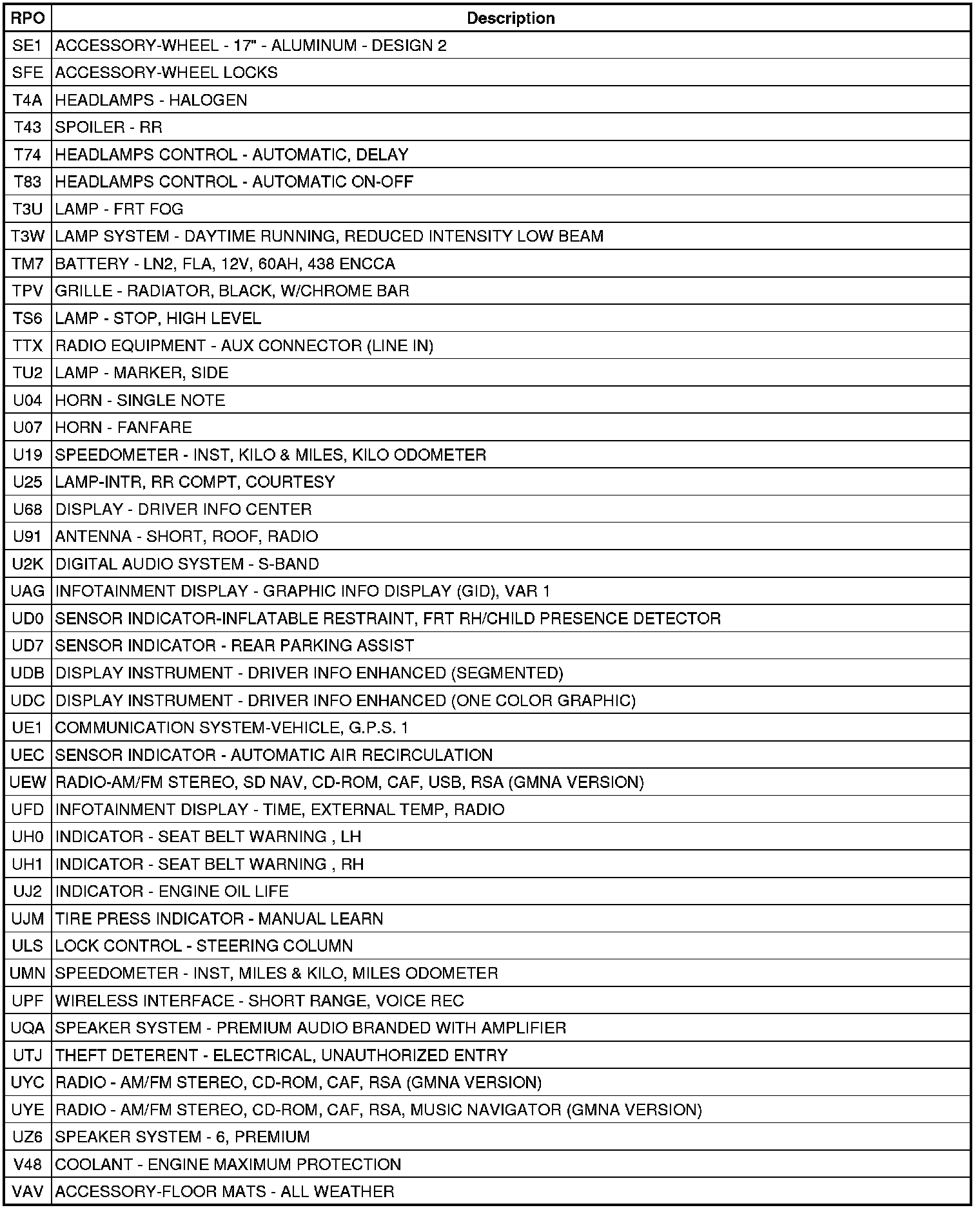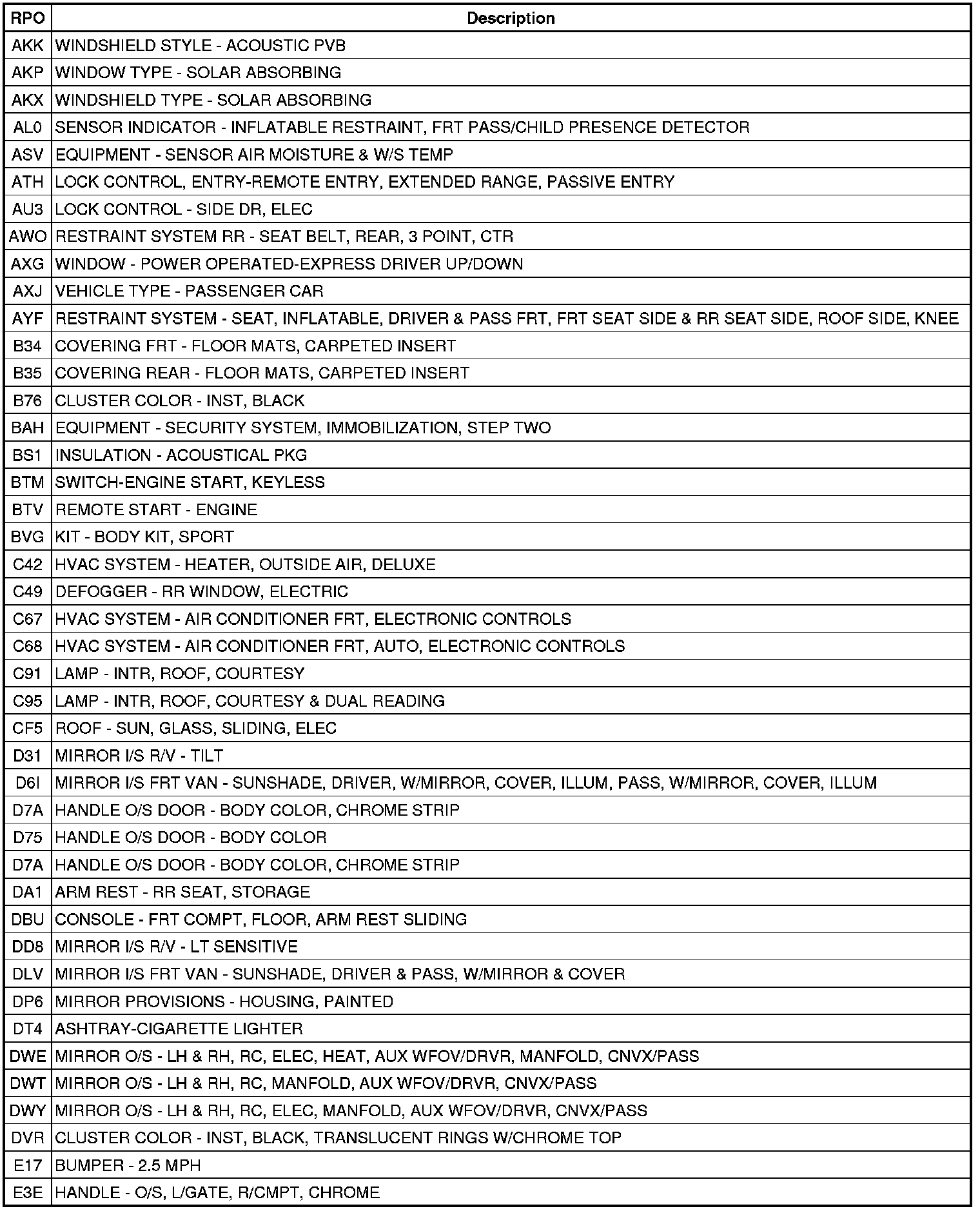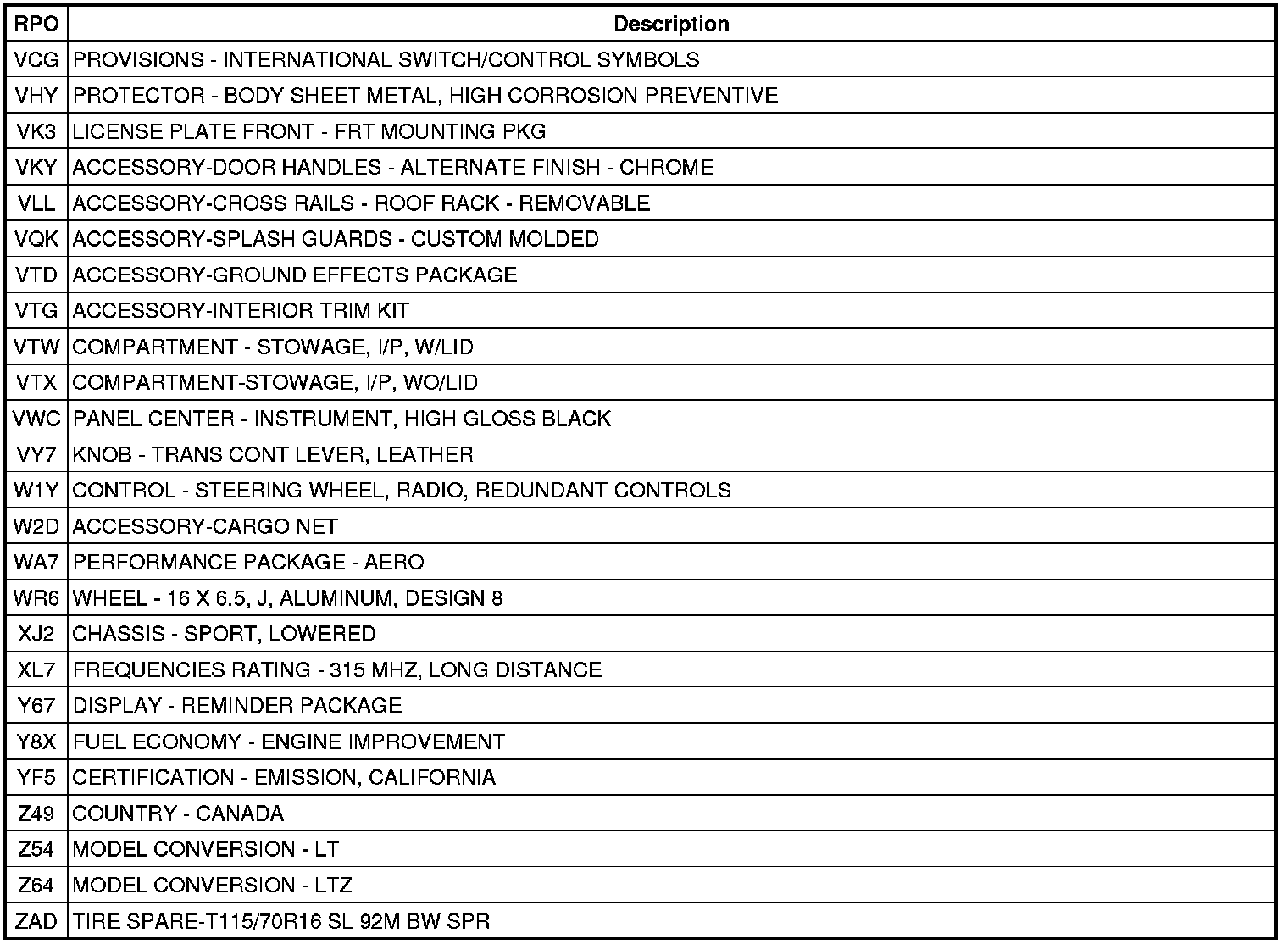 The following table provides the description of the Regular Production Option (RPO) codes that are available on the vehicle. The vehicle's RPO list is printed on the Service Parts Identification Label.