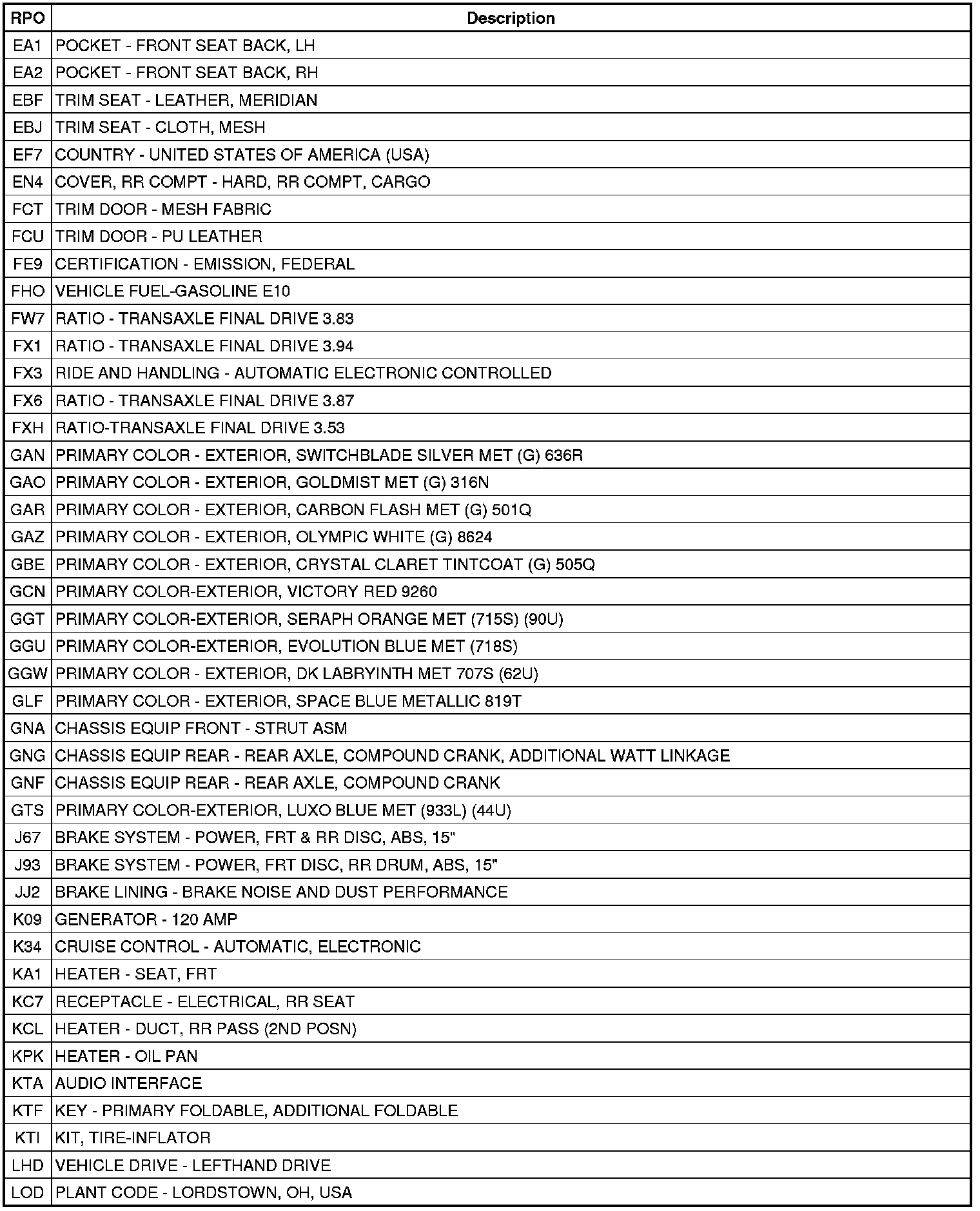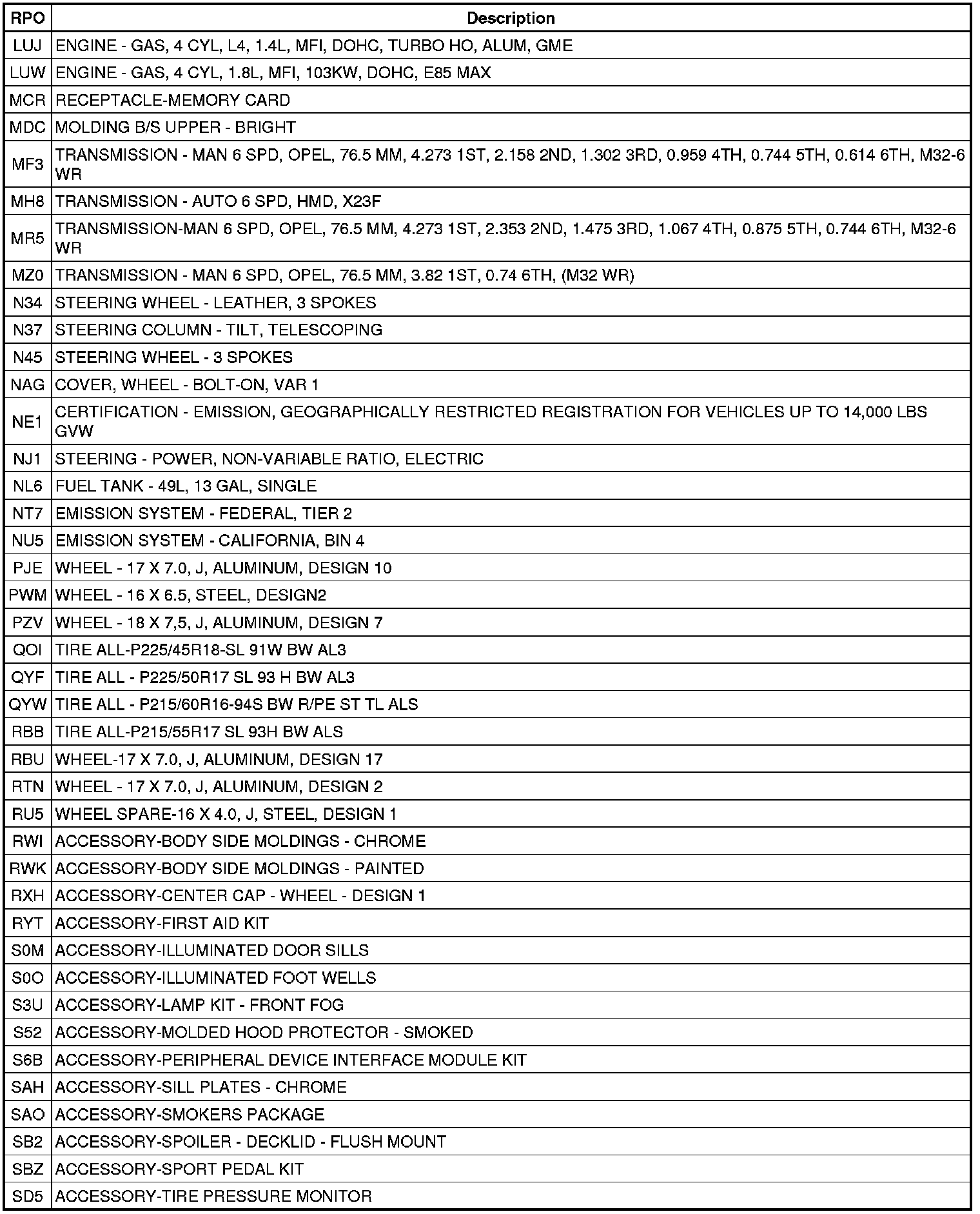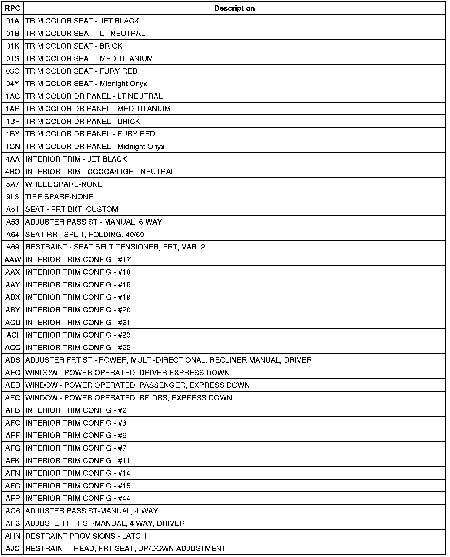 The following table provides the description of the Regular Production Option (RPO) codes that are available on the vehicle. The vehicle's RPO list is printed on the Service Parts Identification Label.