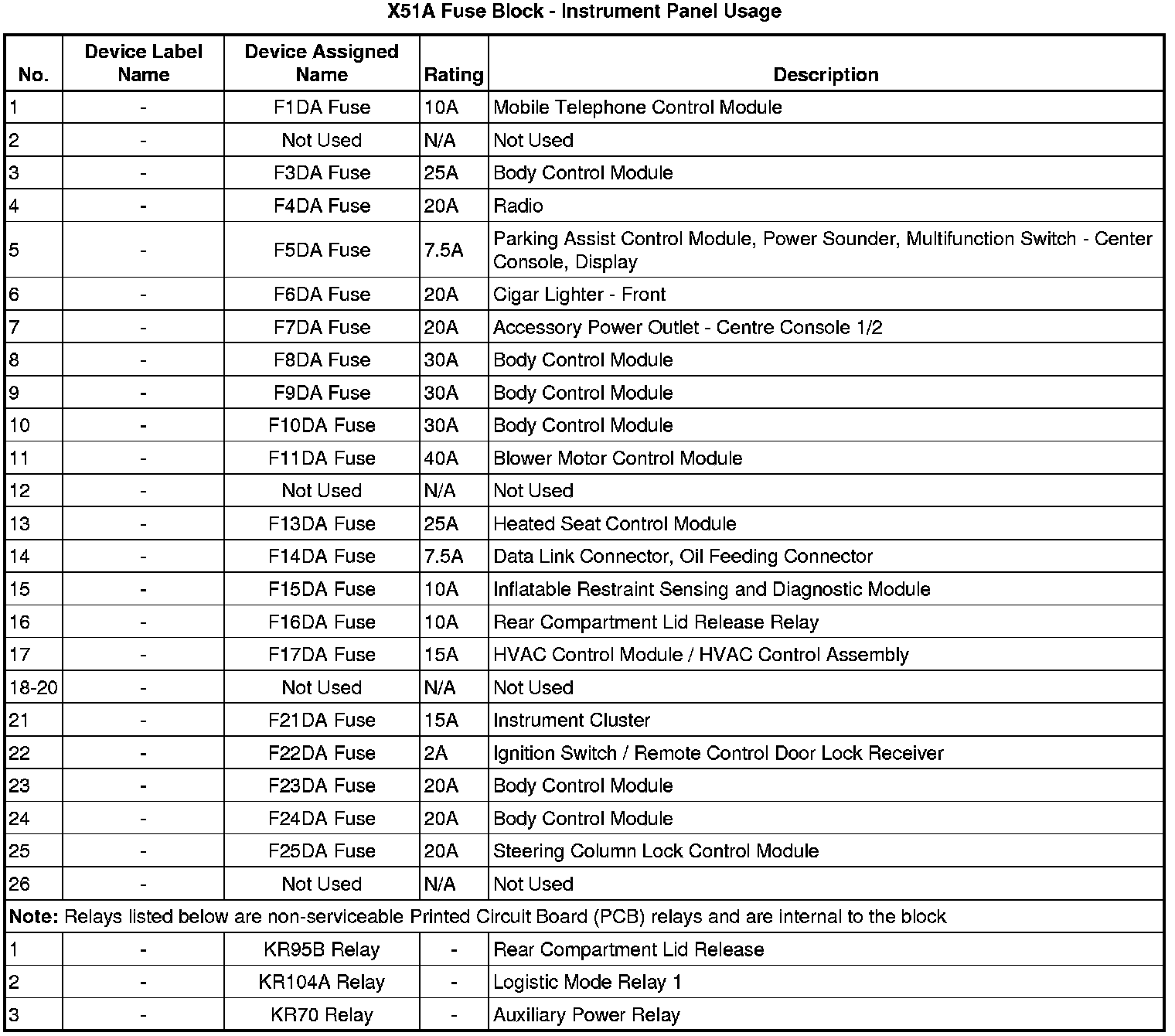 X51A Fuse Block - Instrument Panel Label