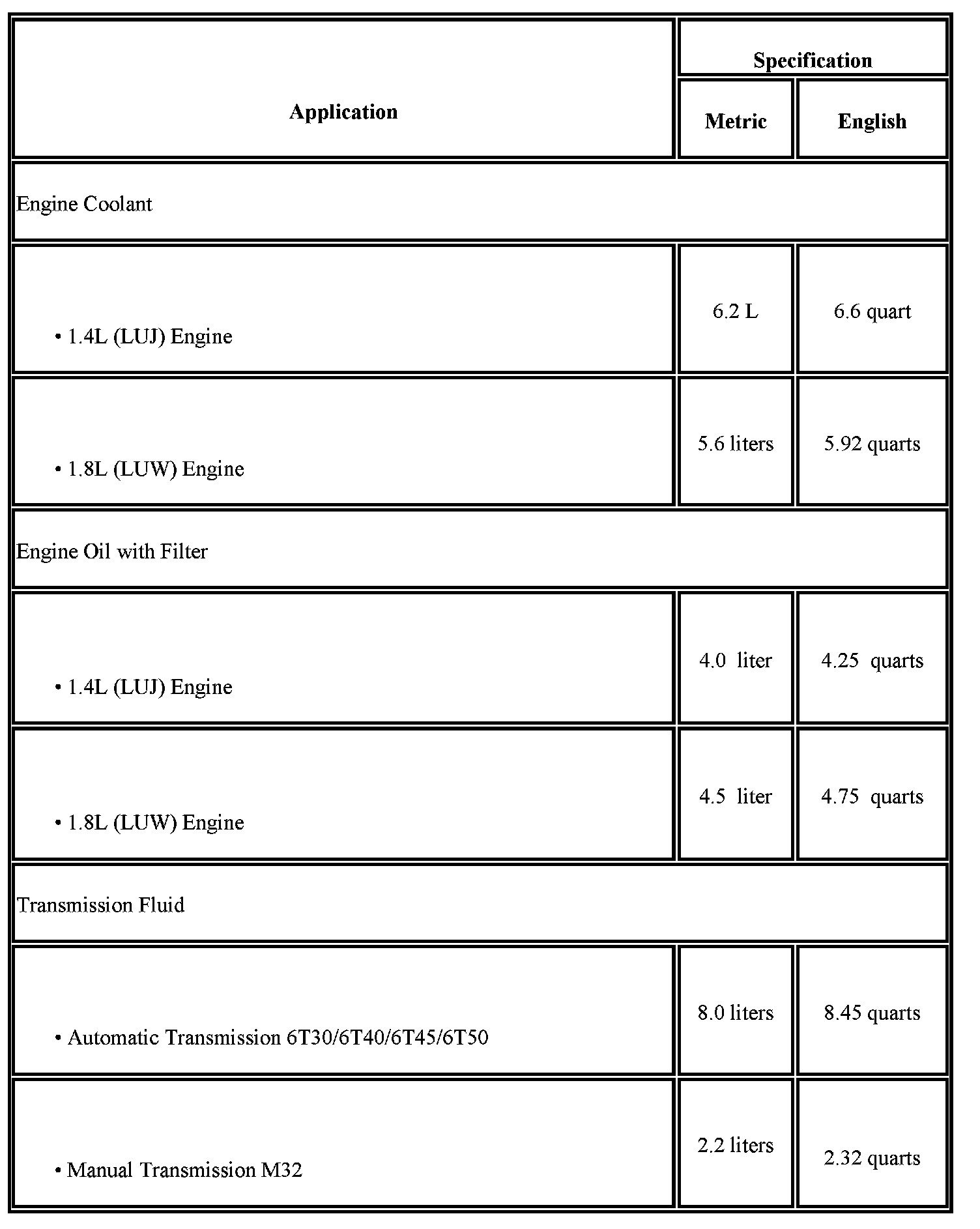 Home >> Chevrolet >> 2012 >> Cruze L4-1.8L >> Repair and Diagnosis >> Specifications >> Capacity Specifications >> Maintenance