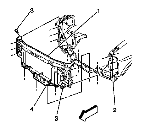 12. Remove the bolts (3) retaining the radiator support (1) to the vehicle.