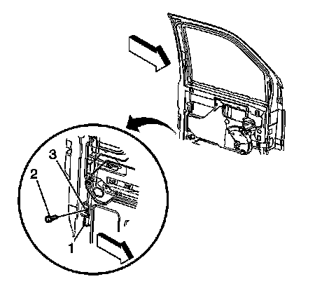 2. Remove the front door rear garnish. Refer to Front Side Door Rear Garnish Molding Replacement Front Side Door Rear Garnish Molding Replacement.