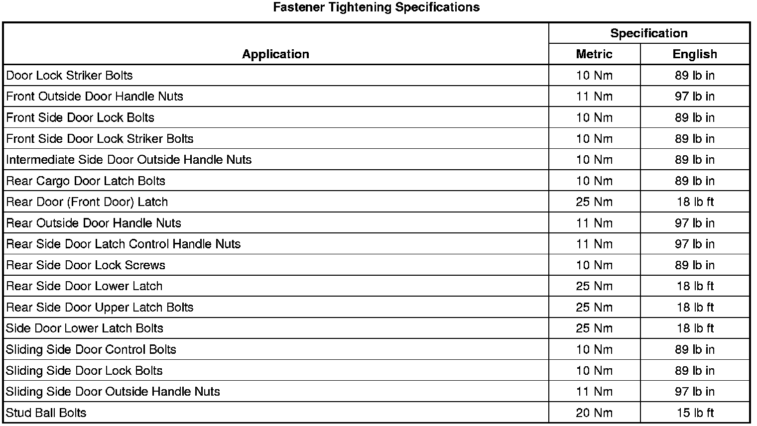 Fastener Tightening Specifications