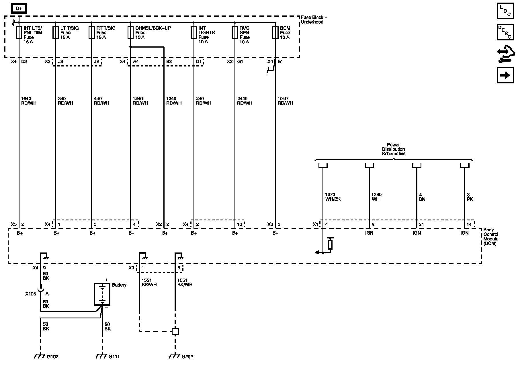 CHMSL/BCK-UP, ECM/TCM, INT LIGHTS, INT LTS/PNL DIM, LT T/SIG, ONSTAR, RT T/SIG, and RVC SEN Fuses