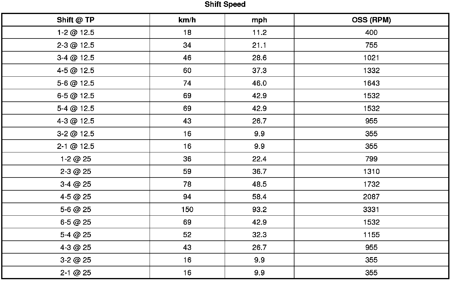 Shift speed points are affected by many different vehicle and transmission operating conditions. The table above represents shift speed points calibrated at specific throttle angles during normal operating conditions and a temperature range between 0-130°C (32-266°F). These shift speed points are also based on an effective final drive ratio of 2.77, and assume a production-intent tire size. The table below illustrates a number of different variables that influence these shift speed points. Based on a given operating condition, these variables may override the normal shift speed points. To assist in monitoring the different variables, the respective scan tool data parameter is also listed.
