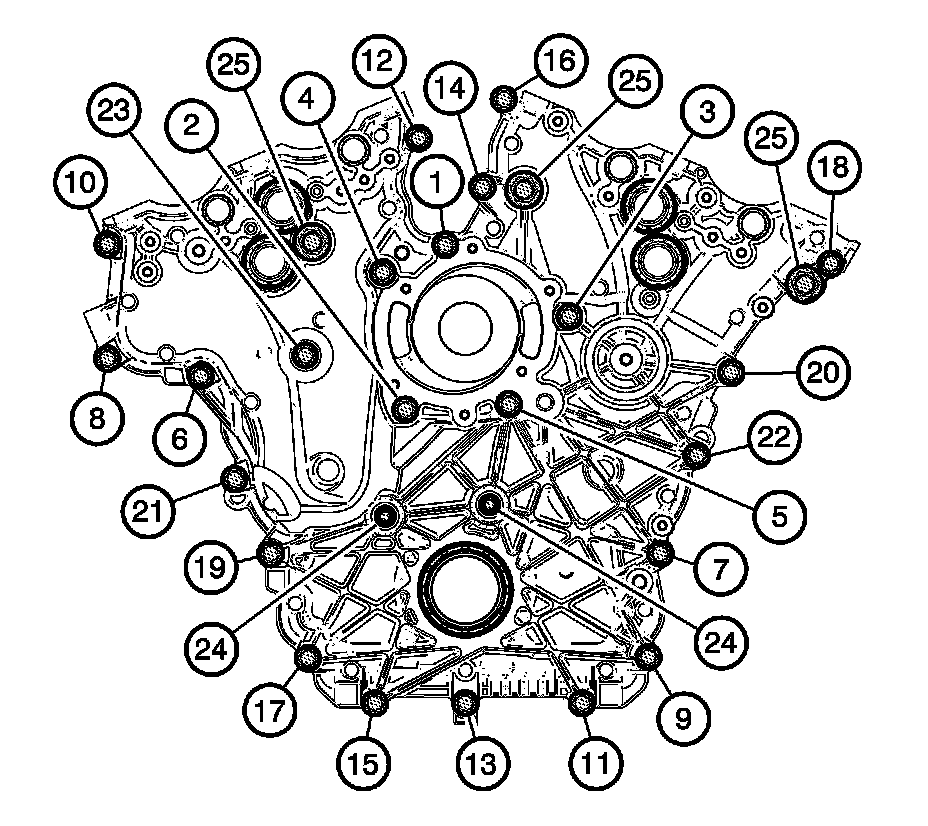 Engine front cover bolts in the number (25) location are model dependent and may not apply.