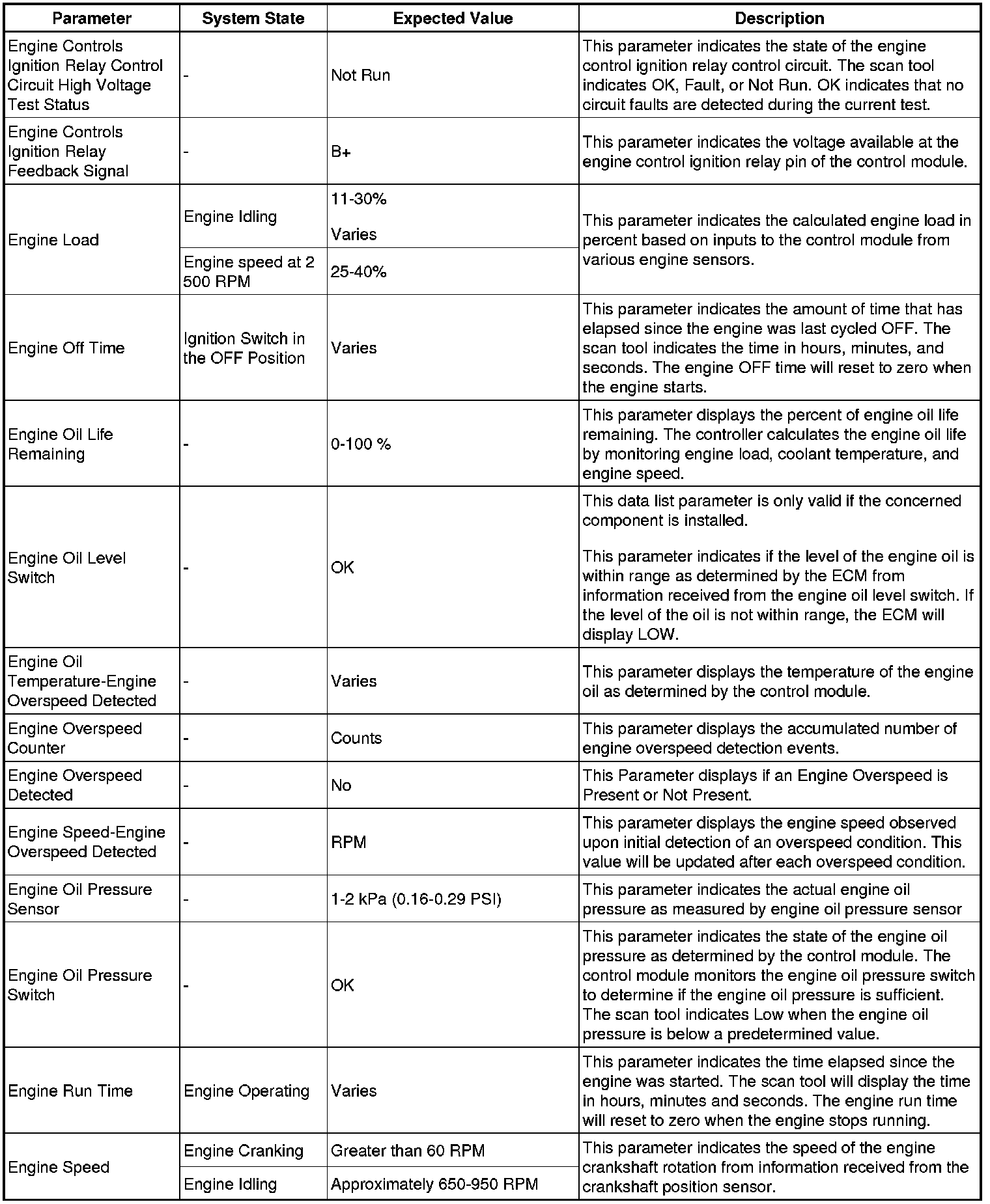 The scan tool values from a properly running engine may be used for comparison with the engine you are diagnosing. The engine scan tool data list represents values that may be seen on a normally running engine.
