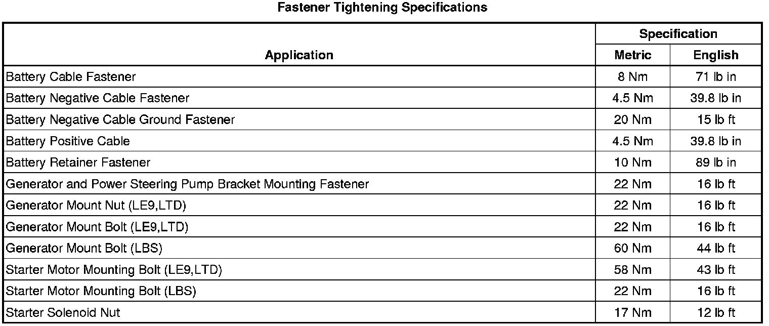 Starting and Charging: Specifications