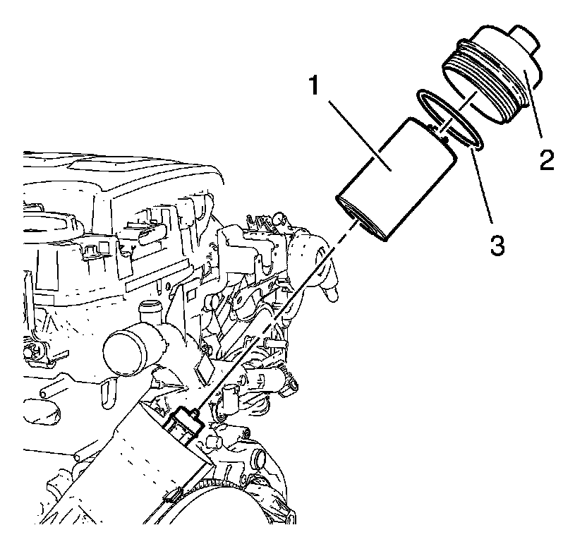 2. Remove the engine oil filter cap (2), cap seal ring (3) and the oil filter element (1).